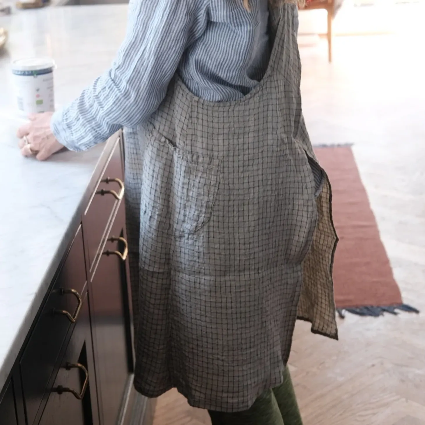 Vask: Vaskes ved 40 grader, og vi anbefaler lufttørring. Forklædet kan stryges, men vi synes, det er flottere og mere ‘høragtigt’ uden strygning