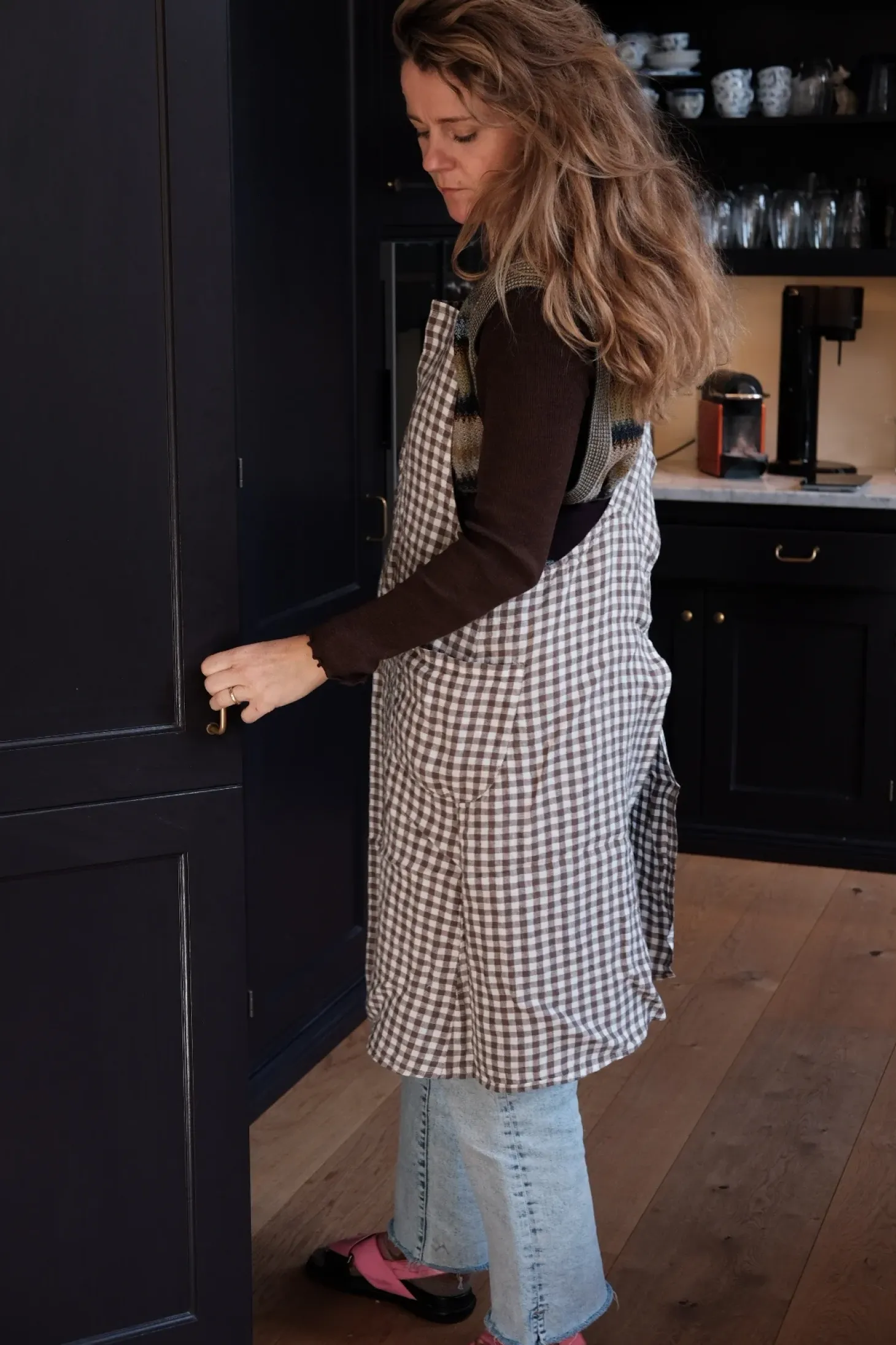 Vask: Vaskes ved 40 grader, og vi anbefaler lufttørring. Forklædet kan stryges, men vi synes, det er flottere og mere ‘høragtigt’ uden strygning