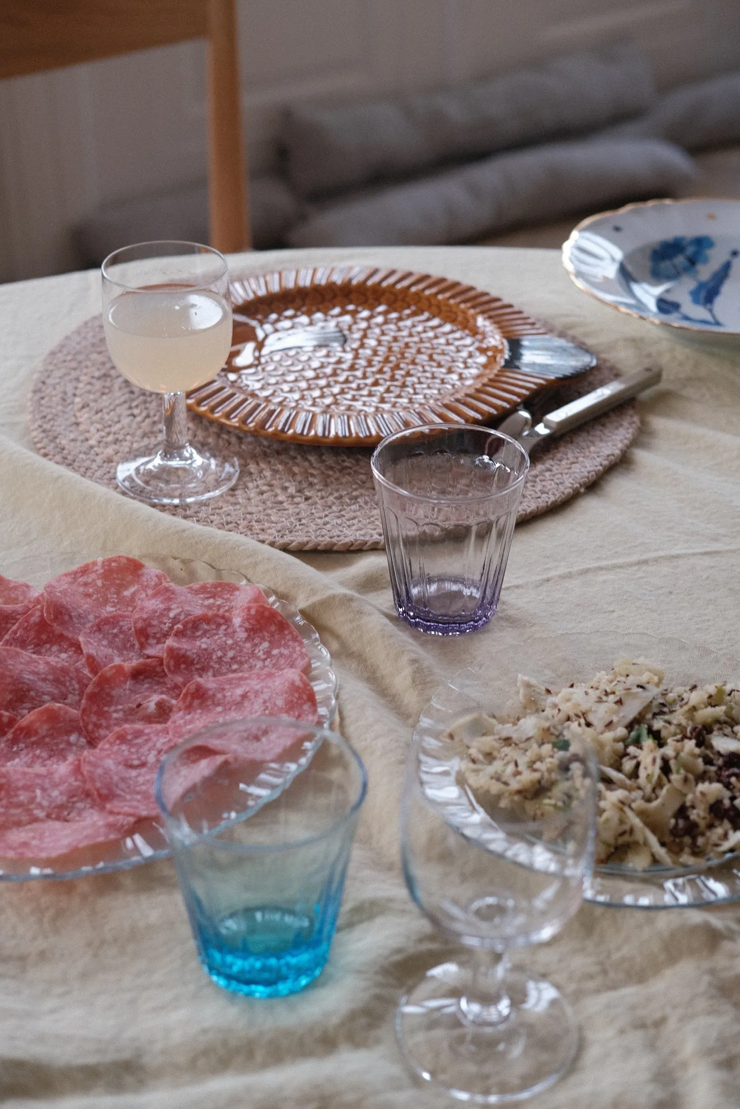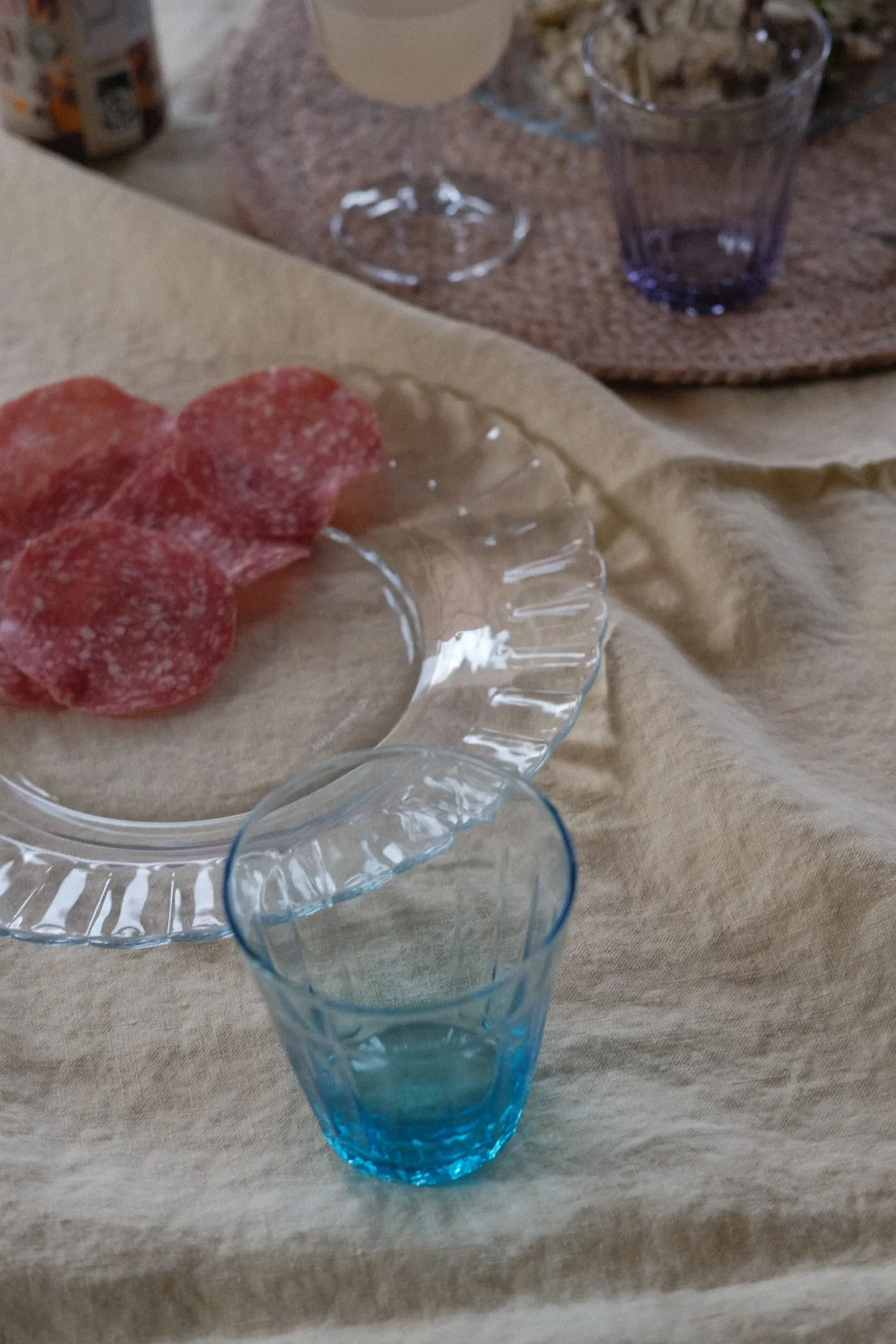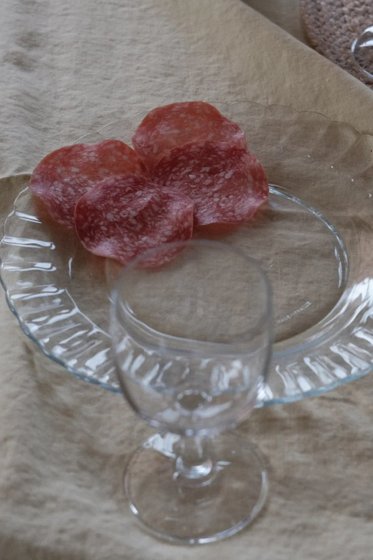En glastallerken med en plisseret og enkel kant. Vi kan godt lide det skrøbelige i en glastallerken, samtidig med at den er hærdet glas så den kan tåle meget. Vi vil bruge den til den daglige frokost.