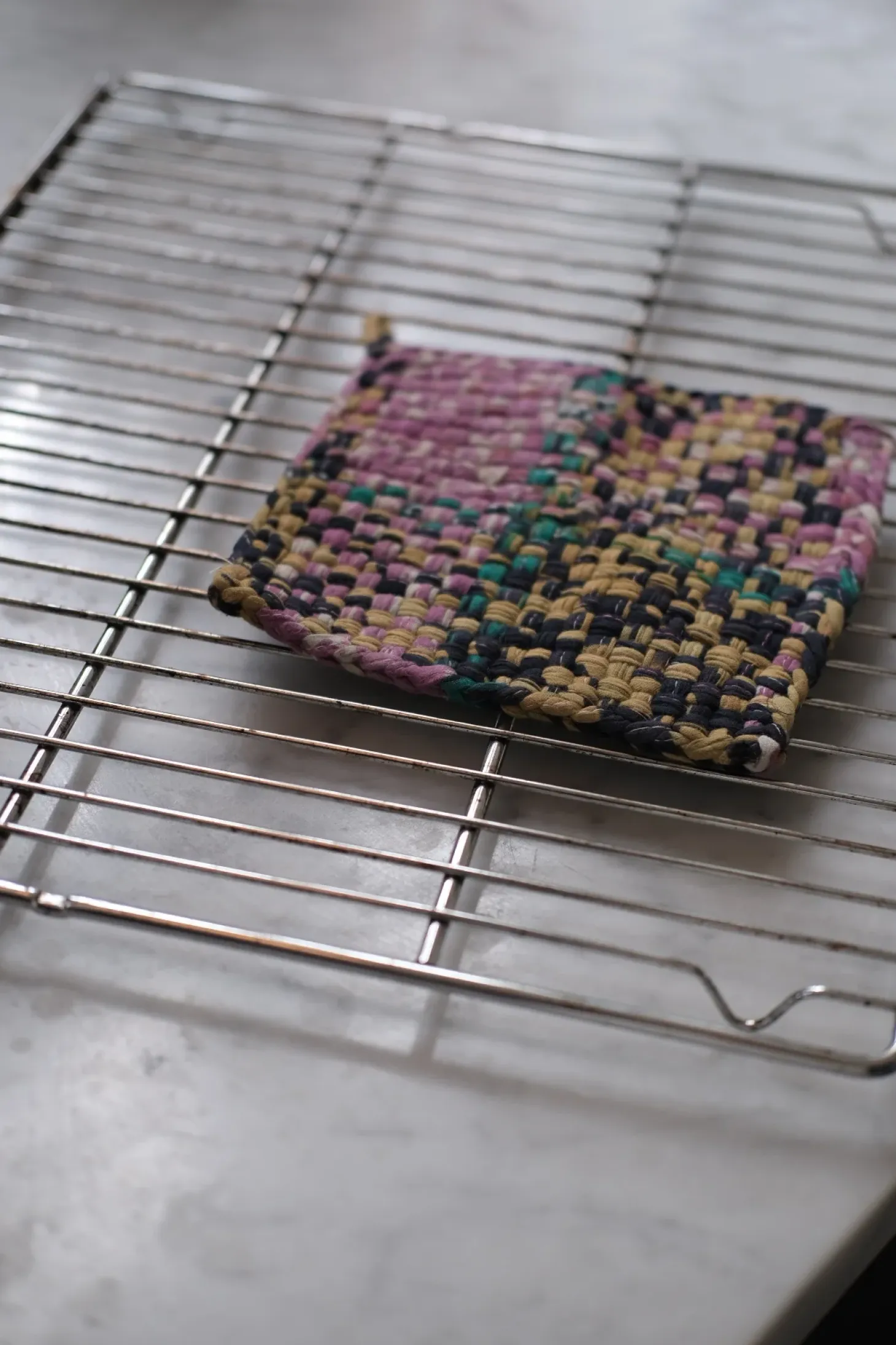 Grydelap i genbrugstekstiler fra Sari’er, syet i Bangladesh.