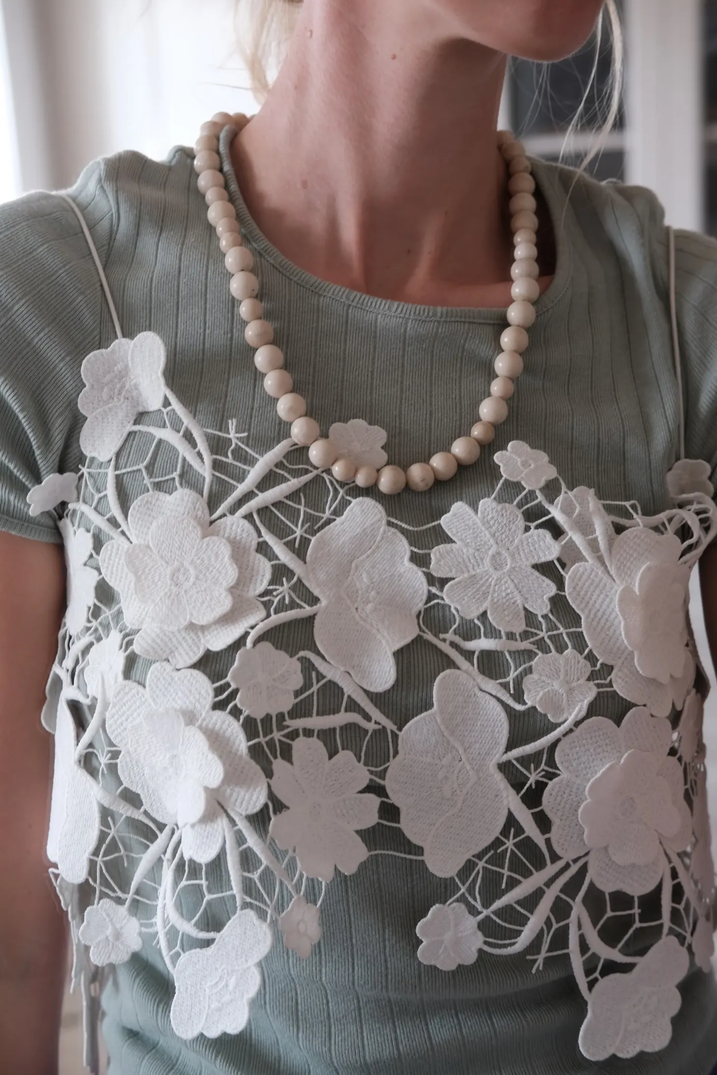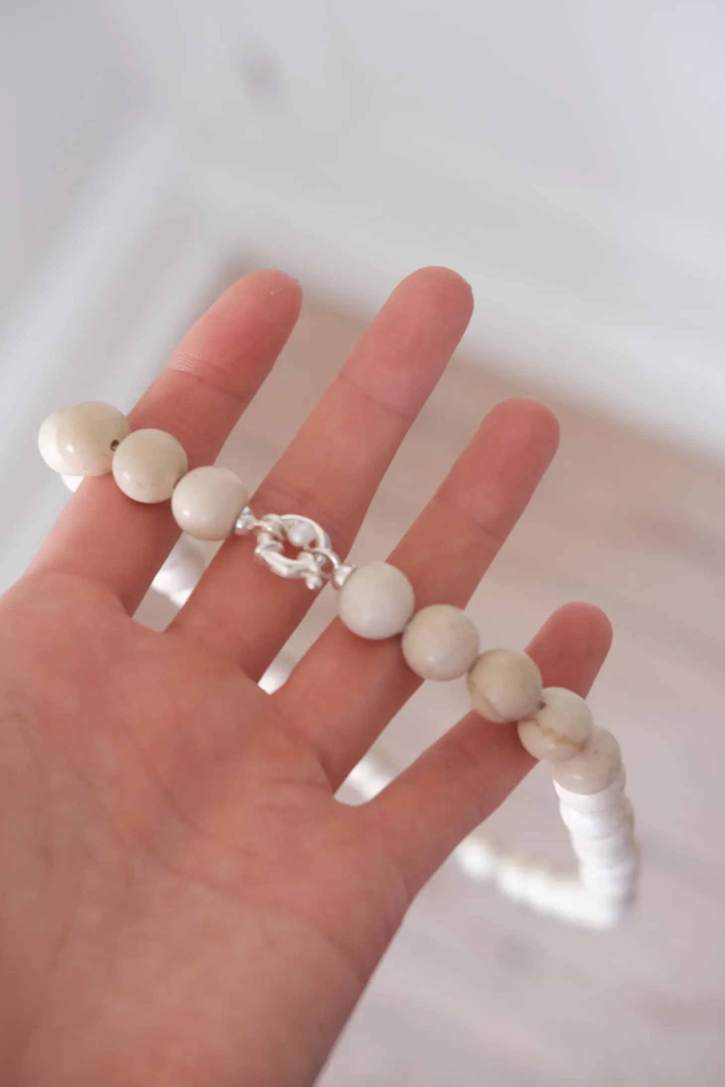 En markant halskæde lavet i højkvalitets halvædelstenen hvid fossil. Den mælkehvide sten varierer i farve. Vi synes den har karakter og er super cool til alt fra en t-shirt til den festlige garderobe.Smykkerne er håndlavet i Holland af et lille team på Labros atelier.