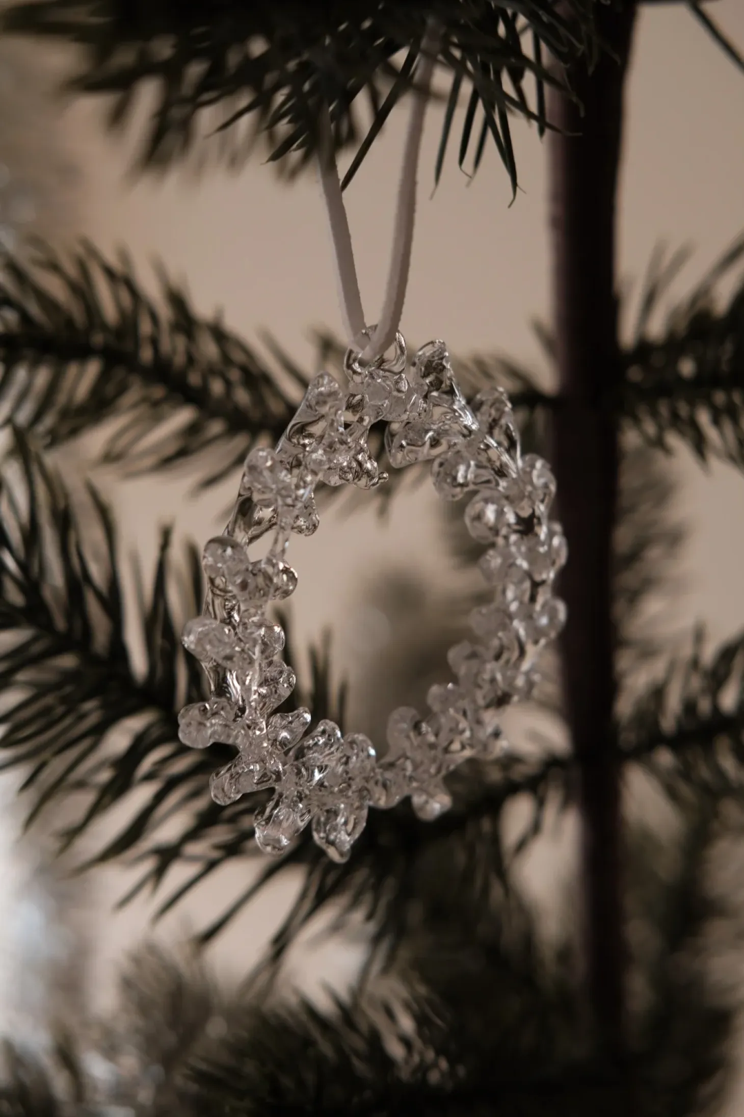 Et ornament i glas, som smukt hænger på træet og fanger det lave vinterlys. Den kunne være til juletræet eller vinduet.