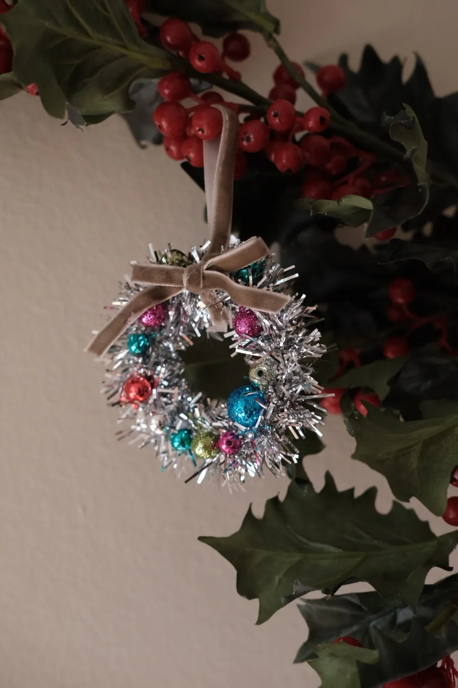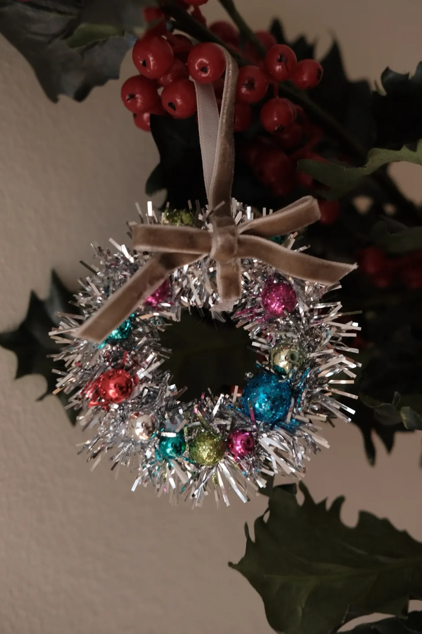 En krans i lametta. Den kunne være til juletræet eller vinduet. Den er meget festlig, pompøs og alt for meget. Helt skøn.