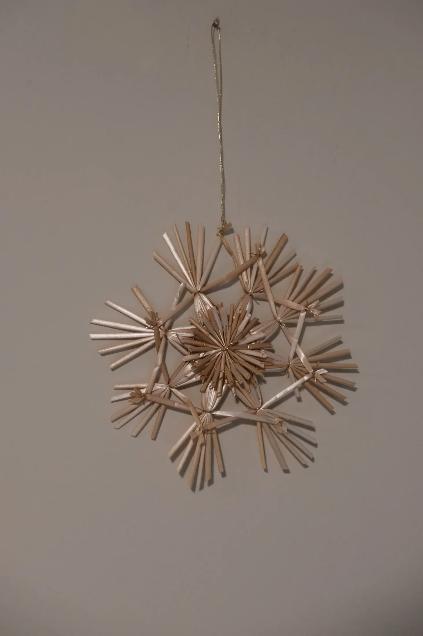 Smukke nostalgiske strå-pynt, som mimer snefnug. Den er så stemningsfuld og kan fungere på juletræet, men også så mange andre steder. Farve: Natur