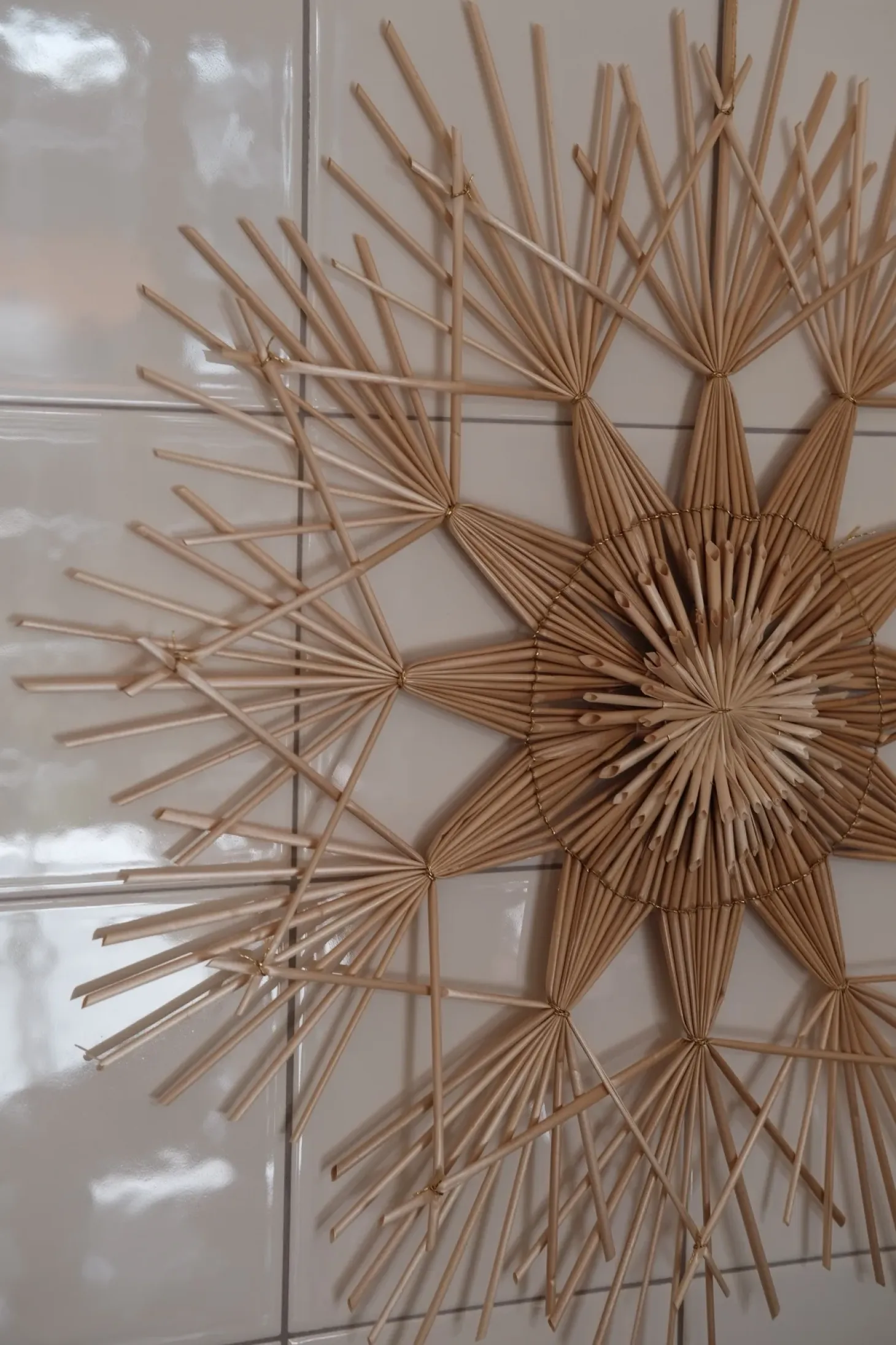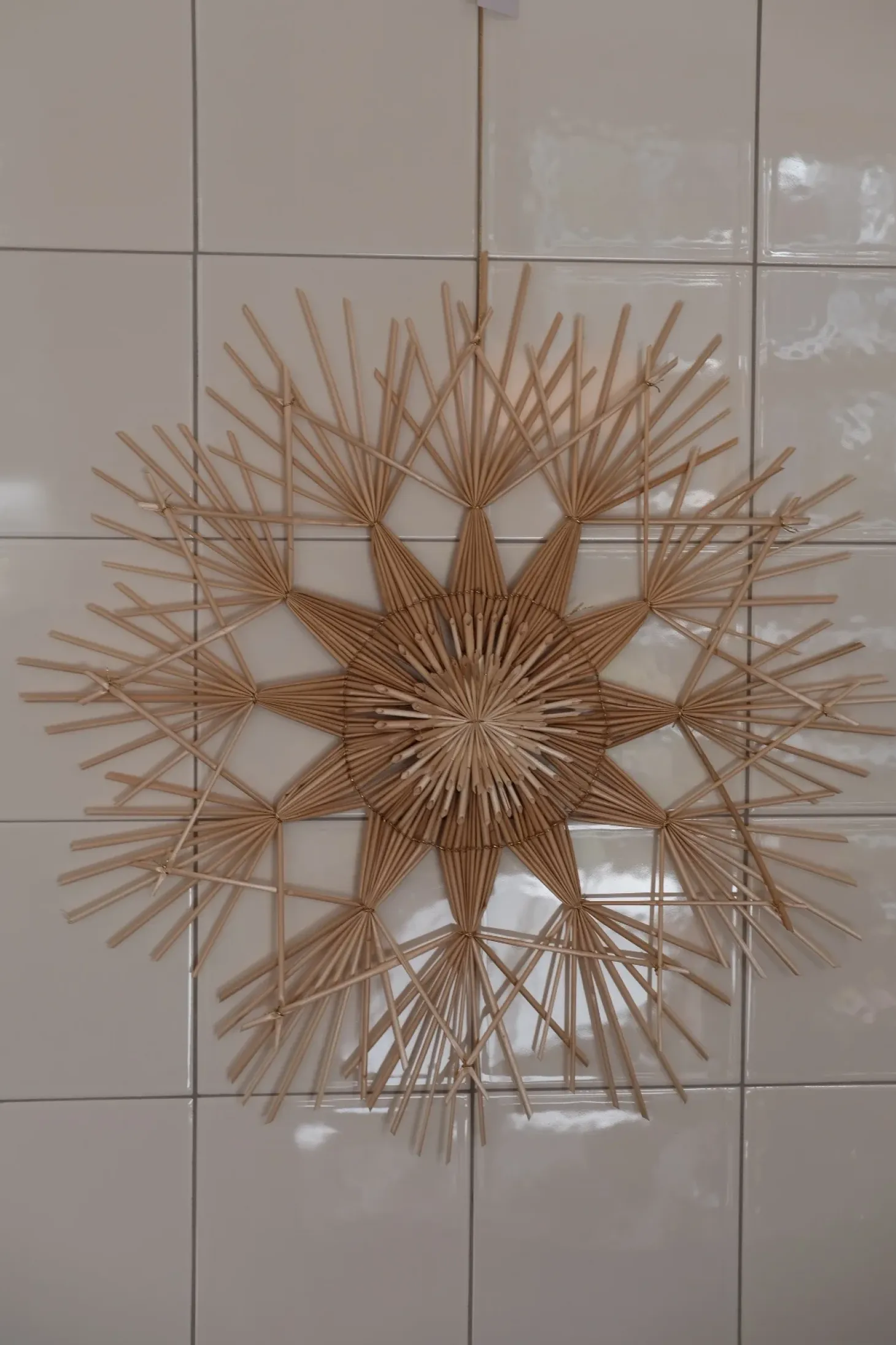 Smukke nostalgiske strå-pynt, som mimer snefnug. Hæng den på døren, væggen eller over en kamin!Farve: Natur