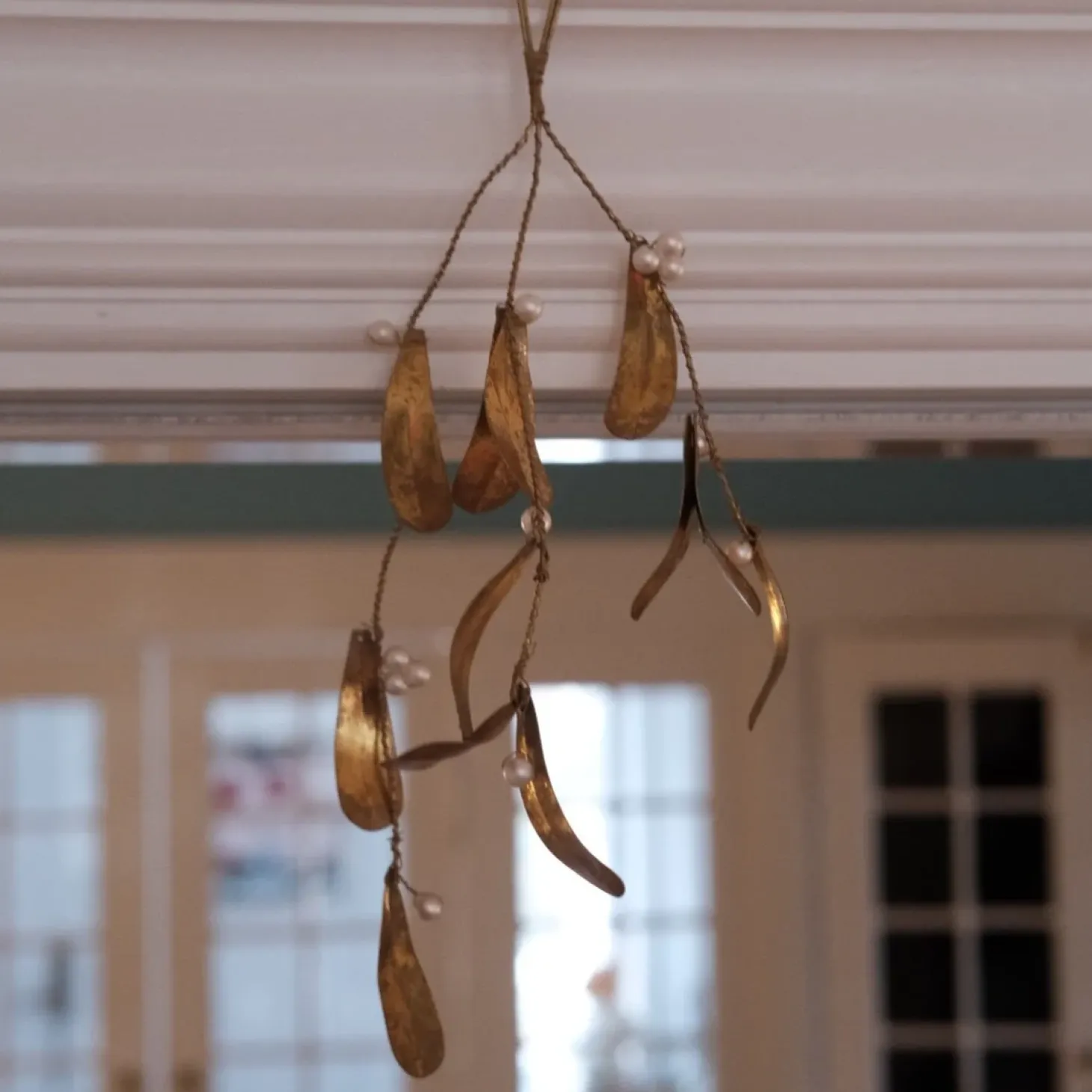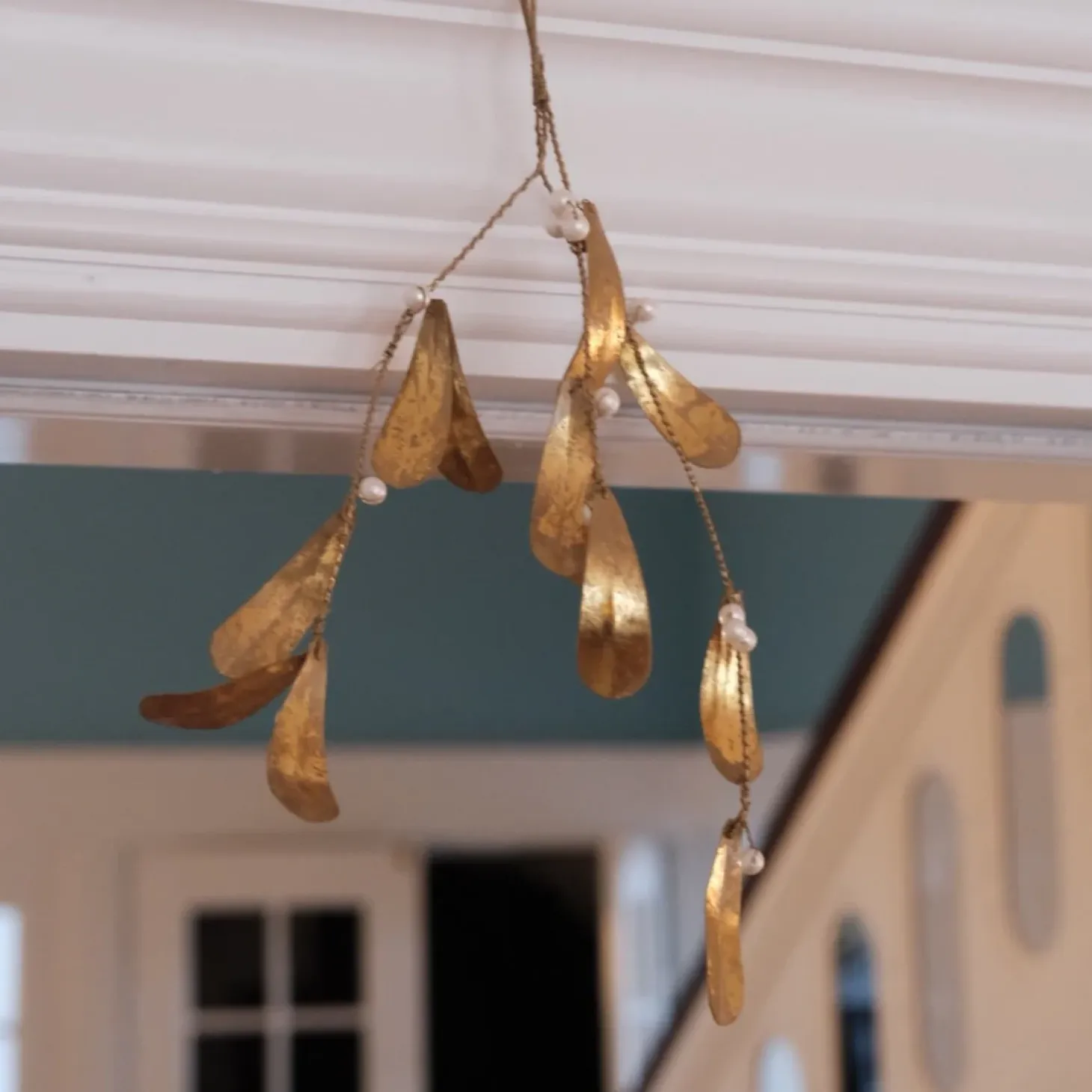 Den skønneste mistelten i irregulær jernblade der er malet gylden og med små perler. Den kan bøjes og kan nemt foldes sammen igen til julen næste år.