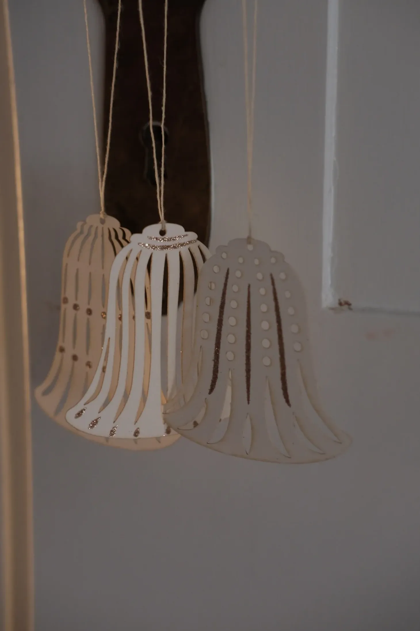 Hvid papir julepynt i form som klokker. Skøn på en pakke til jul, på træet eller andet sted.Der kommer 3 stk i en pakke.