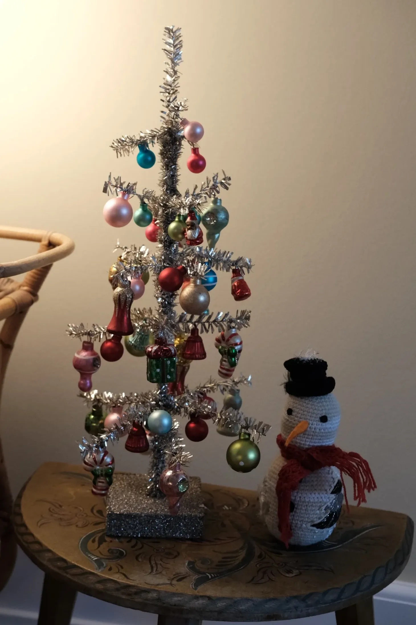 En lille juletræ i sølv glimmer med røde, guld og sølv kugler på.