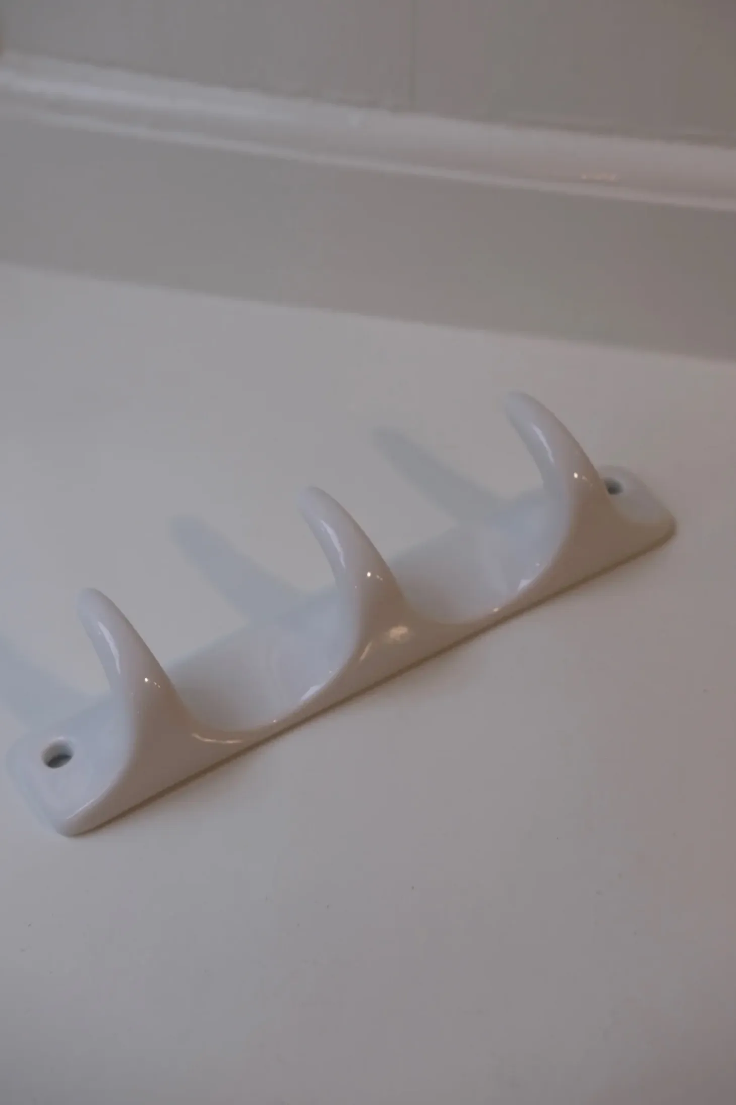 Smuk knage med tre kroge i hvid porcelæn. God til viskestykkerne, gæstehåndklædet, på badeværelset eller børneværelset.