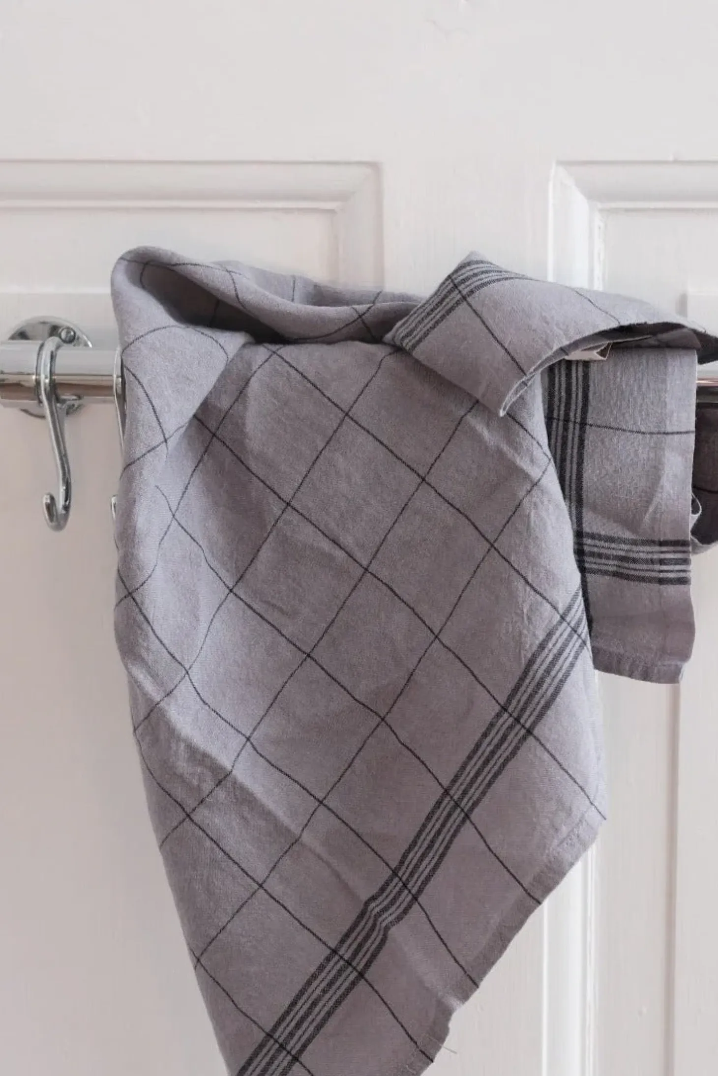 En stang i krom på væggen til opbevaring og ophæng af gryder, håndklæder eller frakker. Den kan bruges i både køkken, badeværelse og entre. Mulighederne er mange og den vil altid kunne bruges et sted i dit hjem. Her i butikken har vi den til viskestykker og håndklæder i vores te-køkken. Derhjemme har jeg brugt den i entreen til børnejakker.