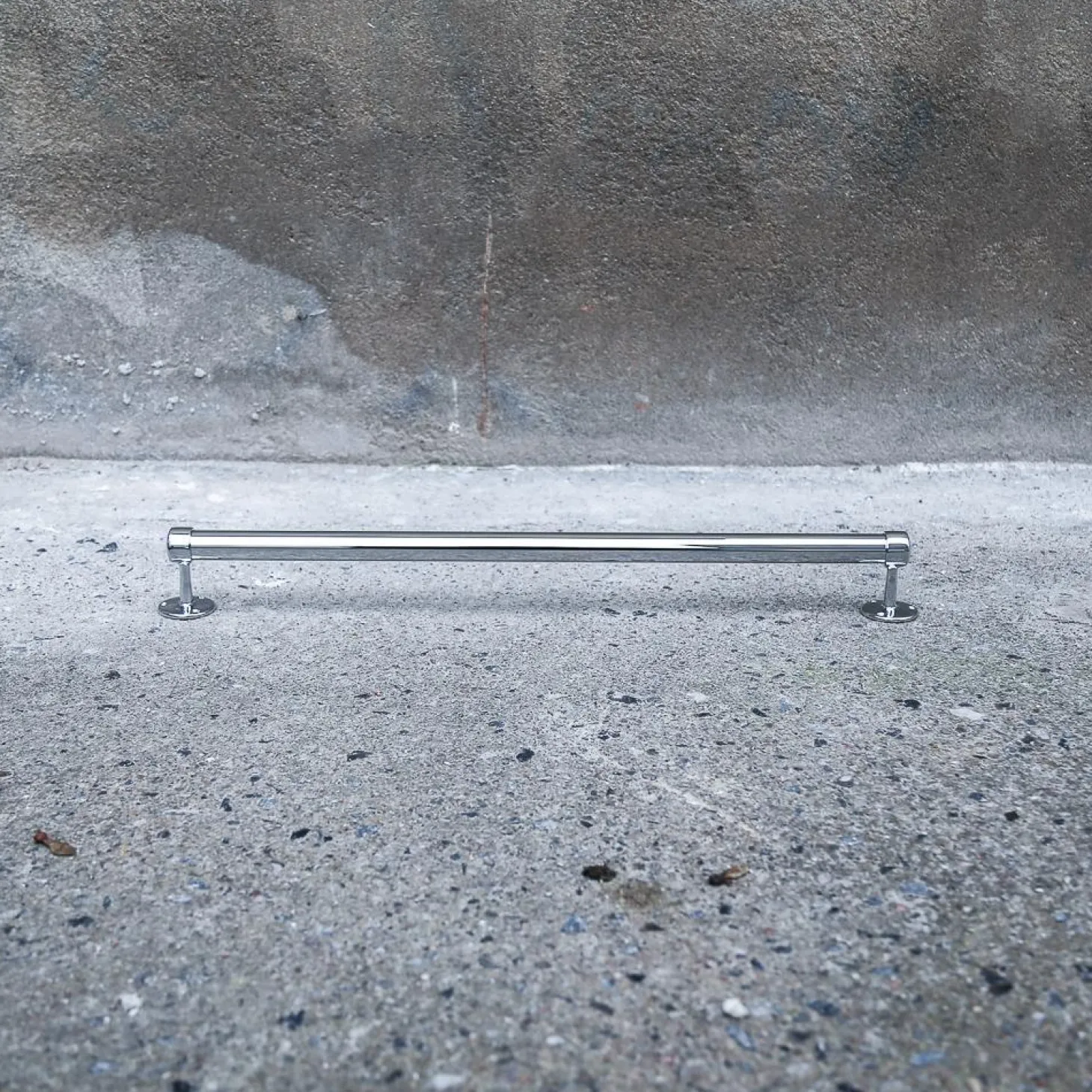 Størrelse: Røret i sig selv er 2,5cm i diameter og længden er 80cm. Endestykkerne er 7cm dybe og afstanden imellem stang og væg vil blive 4,5cm. Pladen der skrues i væggen har en diameter på 4,8cm.