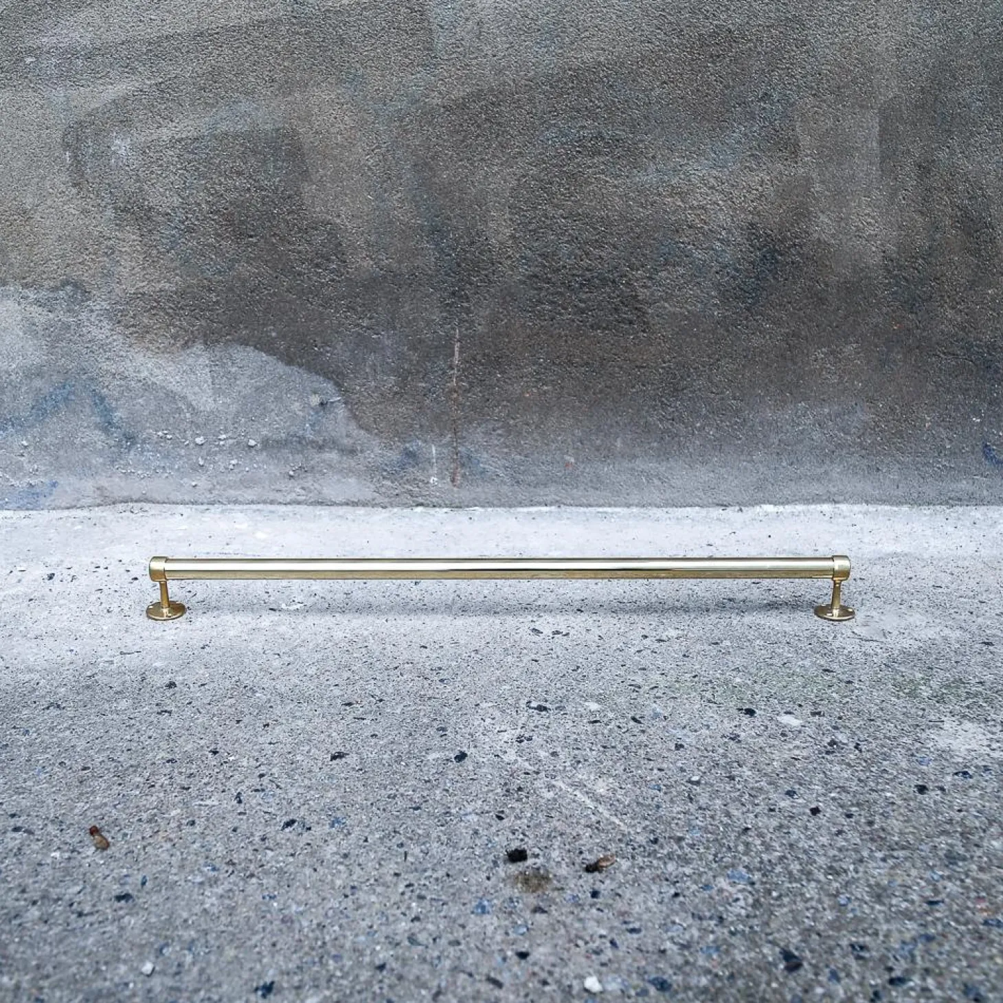 En stang i messing på væggen til opbevaring og ophæng af gryder, håndklæder eller frakker. Den kan bruges i både køkken og entreen. Mulighederne er mange og den vil altid kunne bruges et sted i dit hjem. Her i butikken har vi den til viskestykker og håndklæder i vores te-køkken. Derhjemme har jeg brugt den i entreen til børnejakker. Hvis den skal bruges til tunge gryder er det en god ide at tilkøbe et mellemstykke, så den ikke begynder at hænge af den megen vægt.