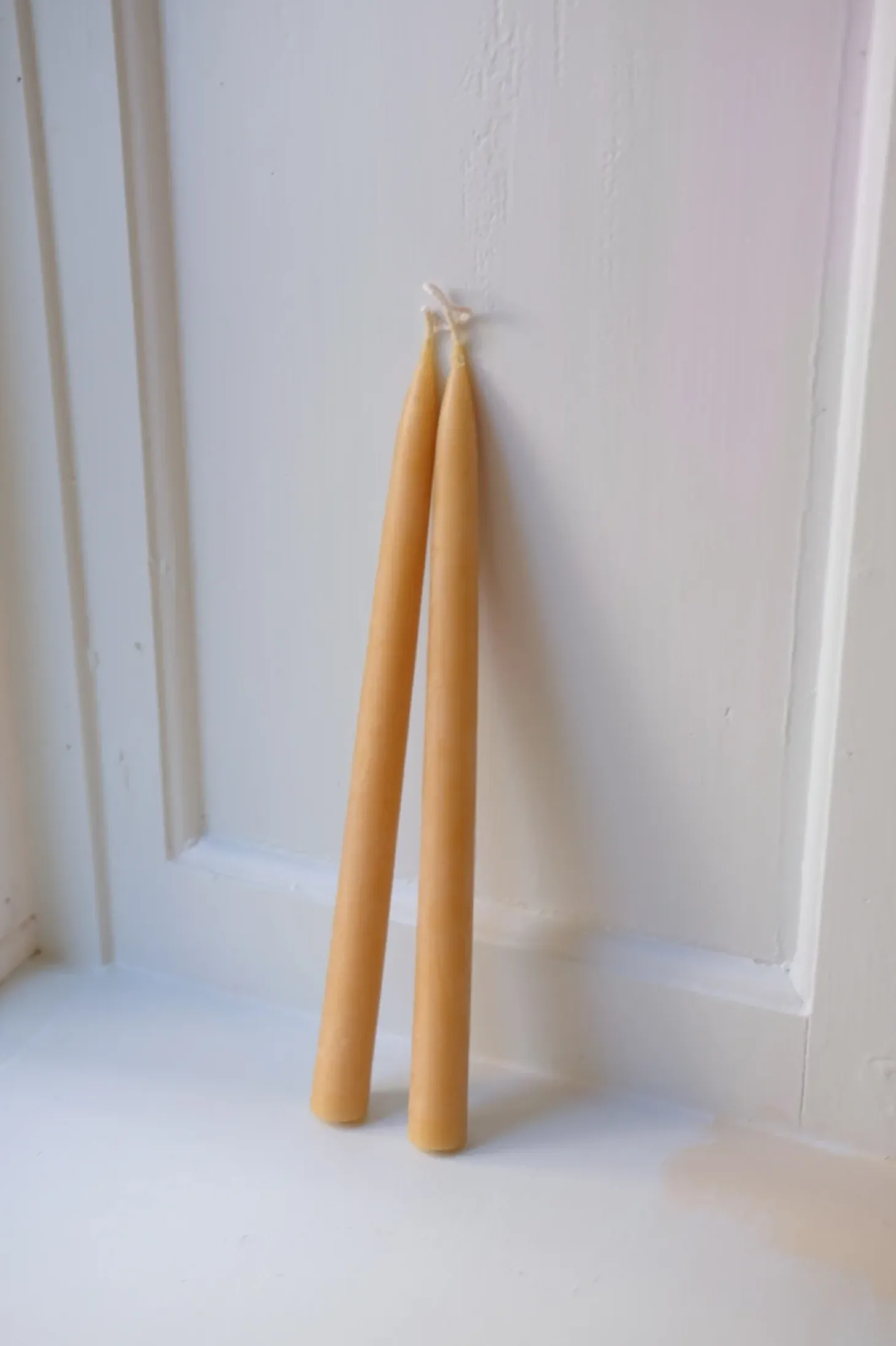 Hånddyppede stearinlys i bivoks produceret i Århus. De brænder uden at sode unødigt og så brænder de længe. Dette er et klassisk kronelys.