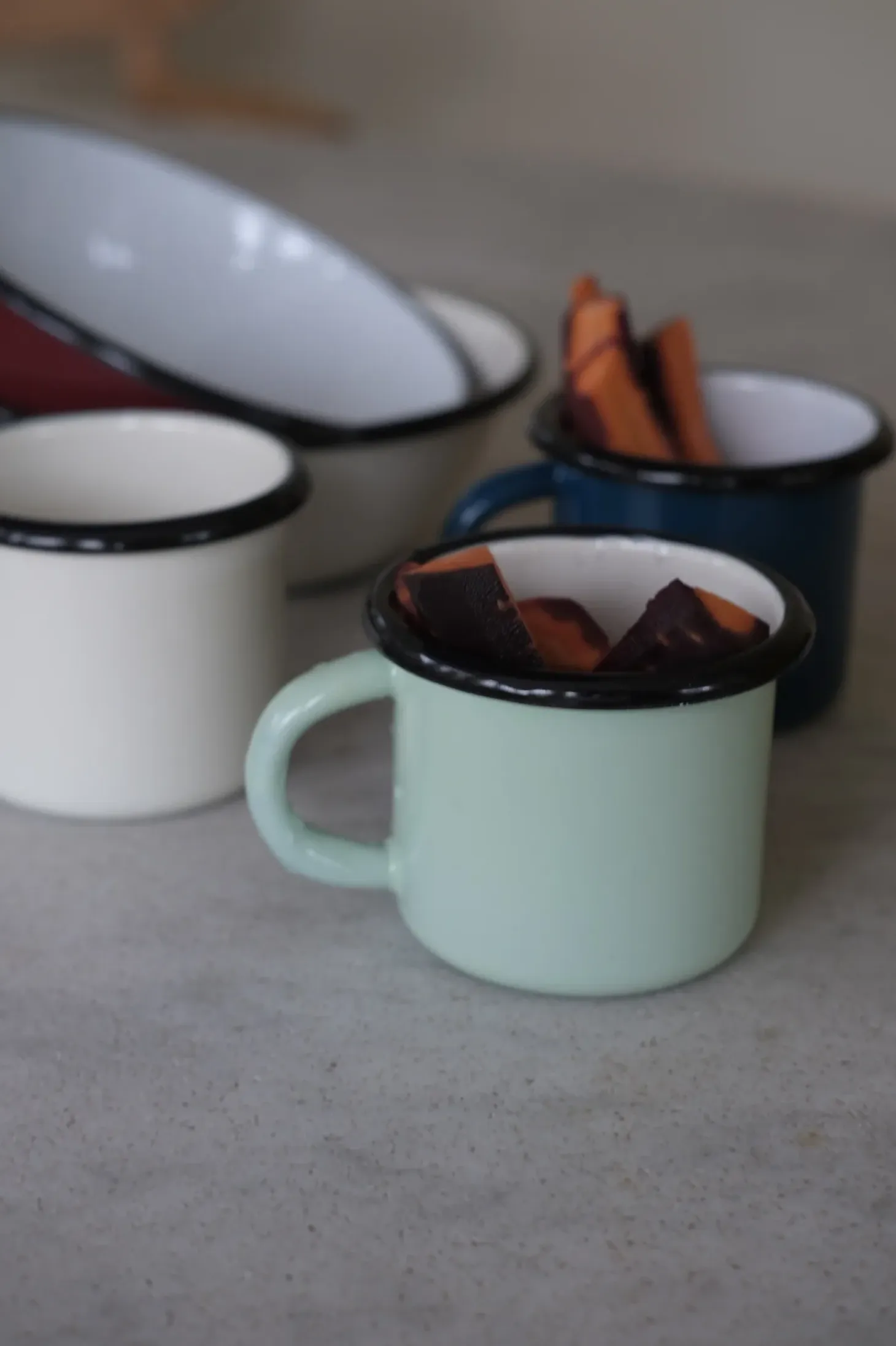 Et emaljekrus med hank. Det er ret let, så det er perfekt at tage med til en picnic, og udover at bruge det til kaffe, kakao eller jordbær, er det også fint til blyanter eller tandbørsten. Denne er til den lille kaffe eller børn.