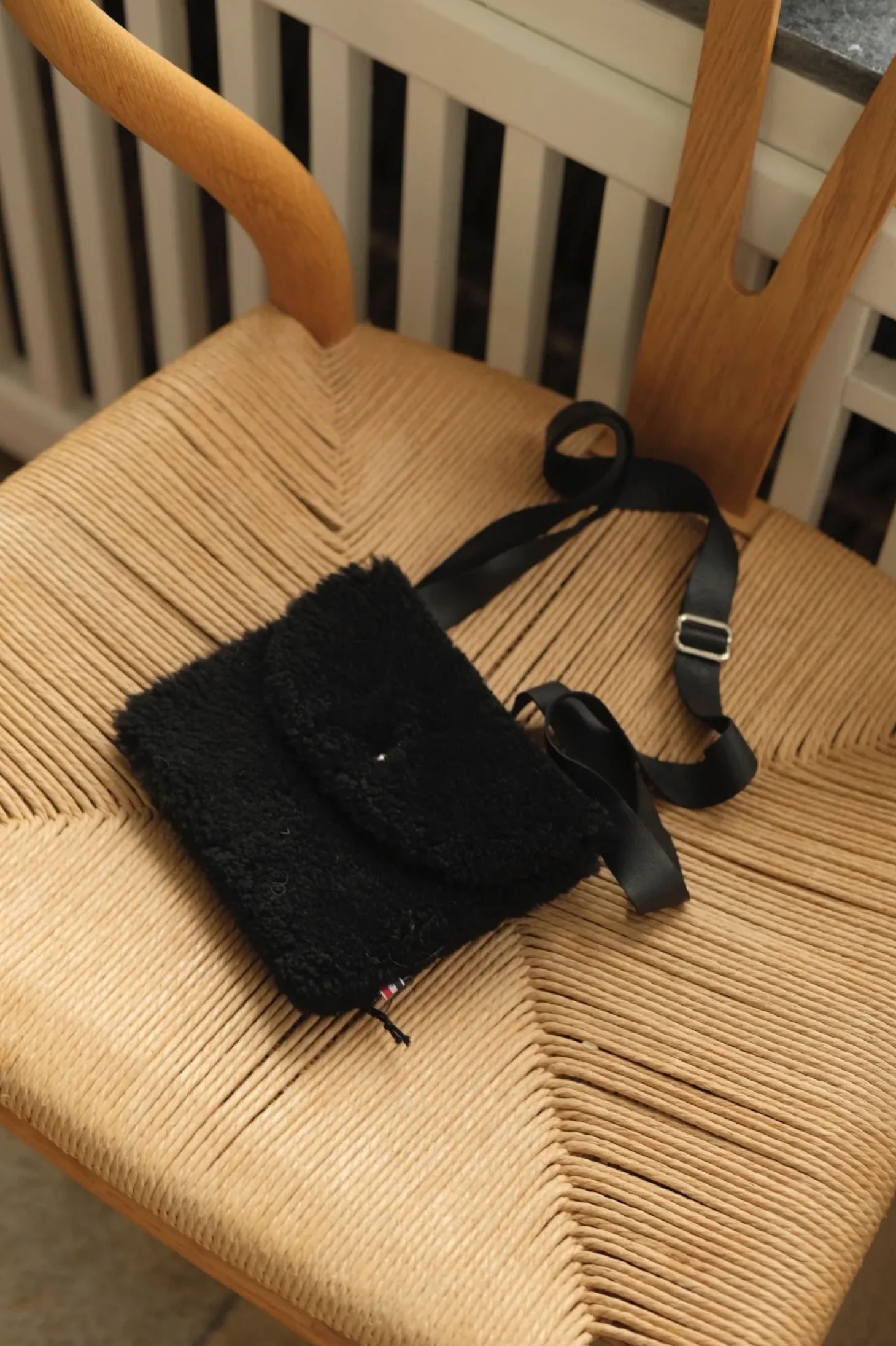 Materiale: Fåreskind, bomuldstrop og metal-detajler.