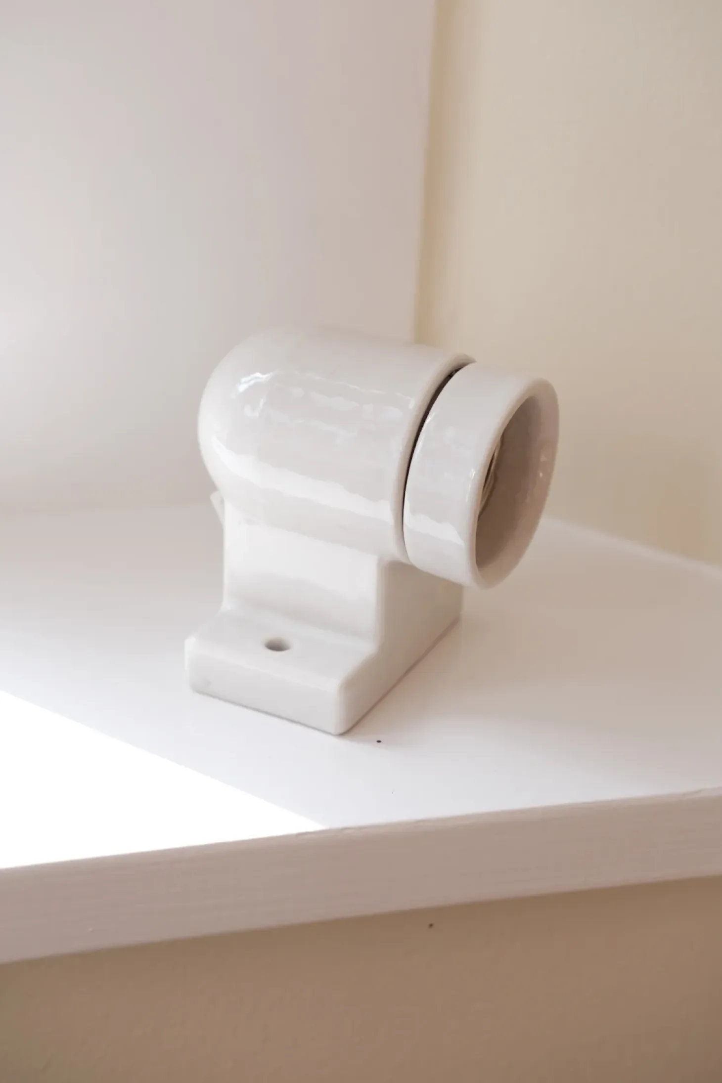 Porcelænslampe til væggen. Det er en fordel hvis ledningerne kommer ud samme sted, således at lampen dækker direkte over ledningerne.