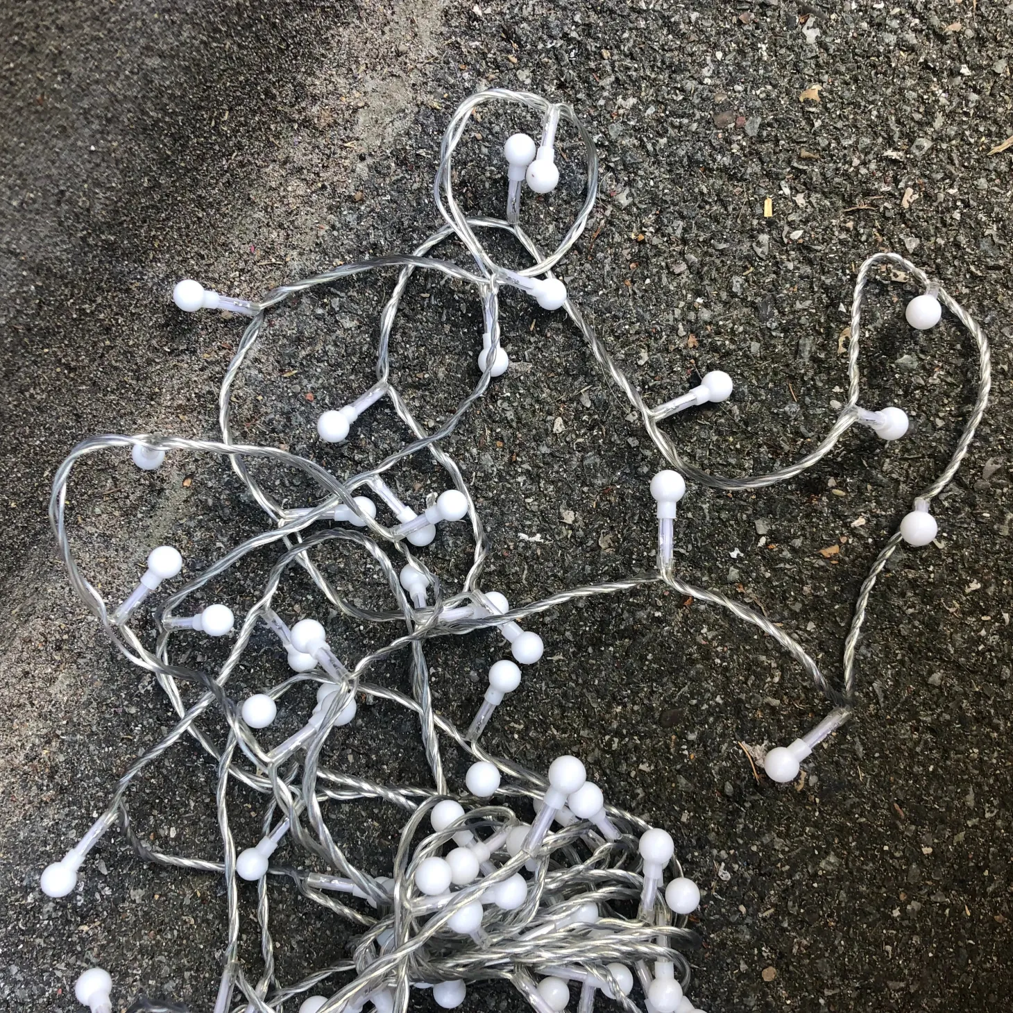 En 11 meter lang ledning med 80 små LED pærer fordelt med ca 6cm imellem. De første 5m er uden pærer, så den kan komme hen til en stikkontakt. De små pære lyser svagt, så den giver en smule lys, men ikke nok til at læse en bog.