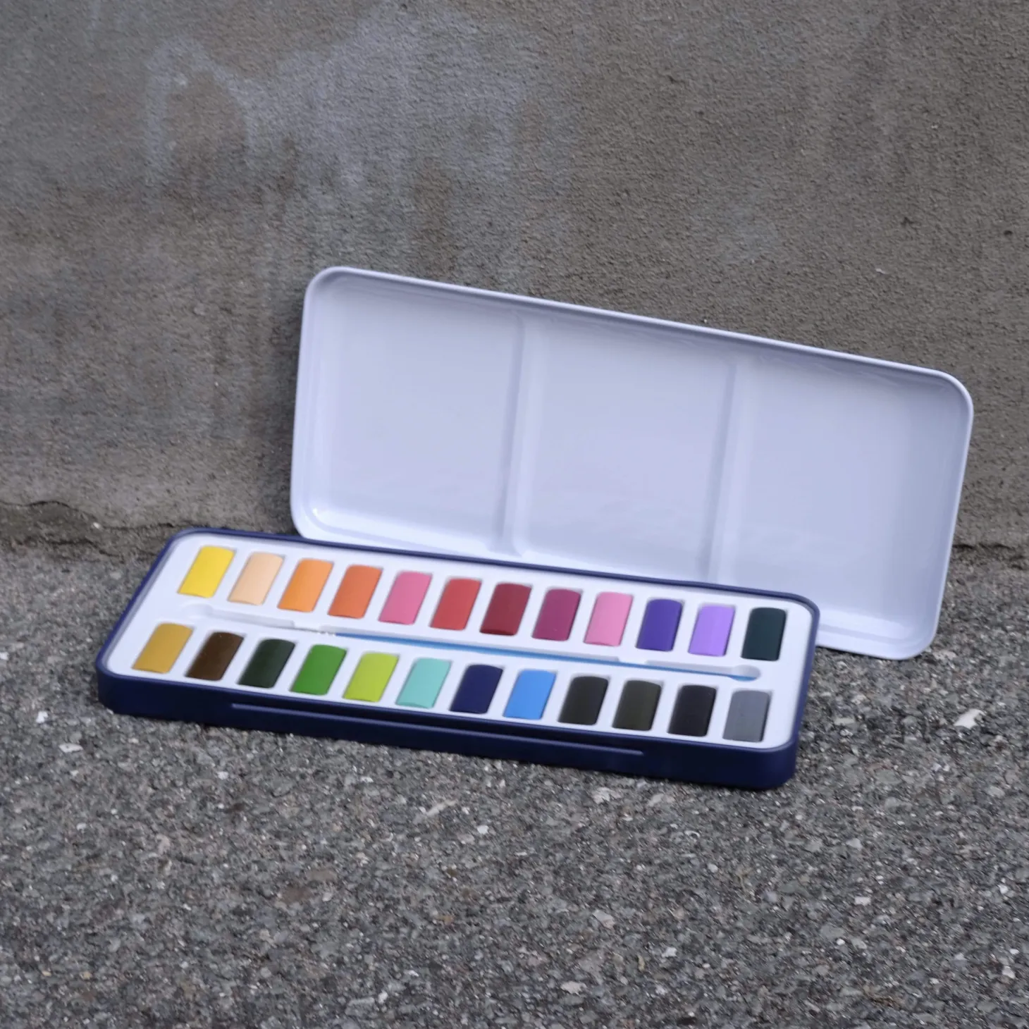 Metalæske med 24 akvarelfarver i stærke farver samt en pensel .Æskens låg kan bruges som palette, så man kan blande farverne.Ideelt til den lille kunstners første malerier!