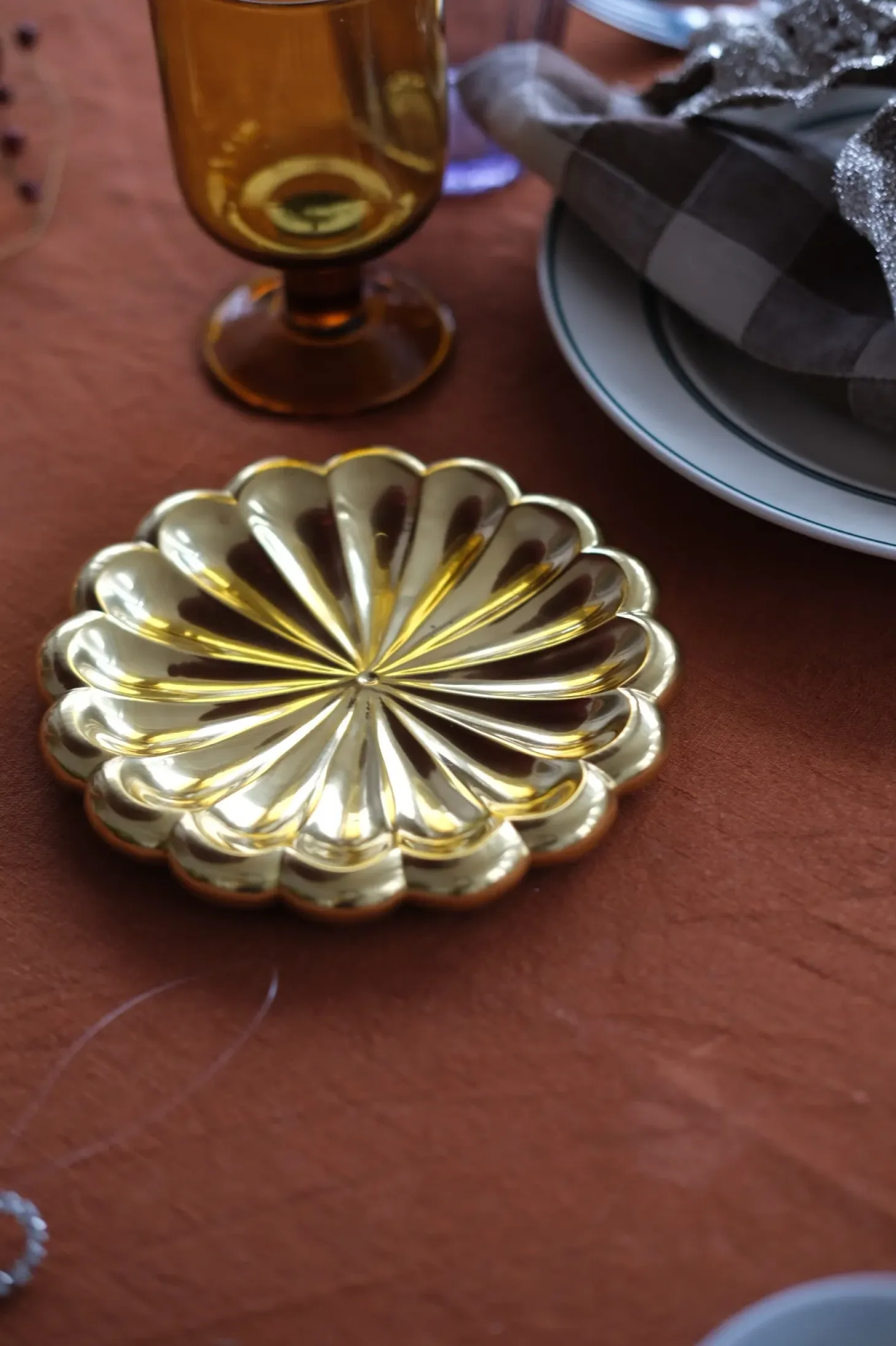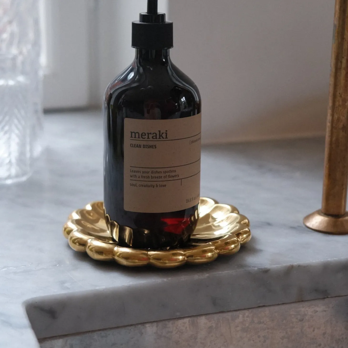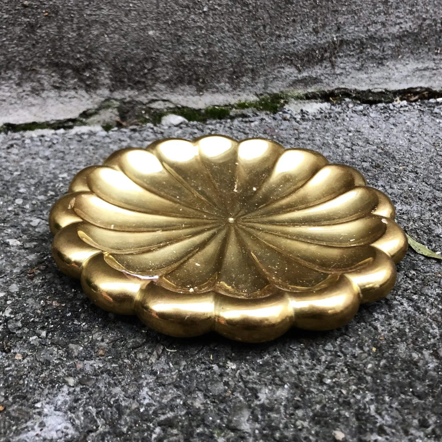 Lille fad i støbt messing i en form inspireret blomst. Vi bruger fadet til nøgler og smykker, eller som en lille underskål til opvaskemidlet i køkkenet. Det er også et fint lille fad til f.eks. sæben i badeværelset.