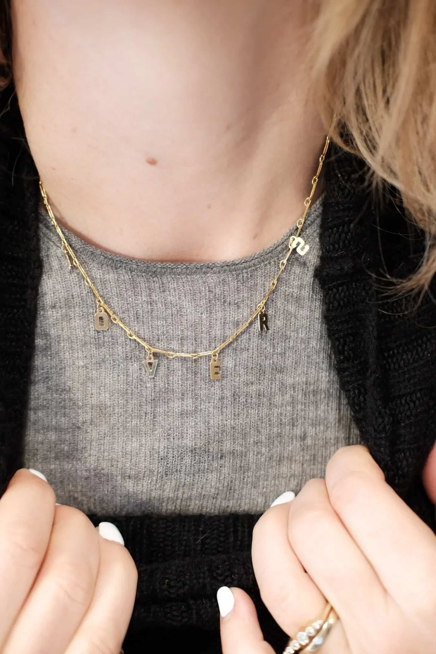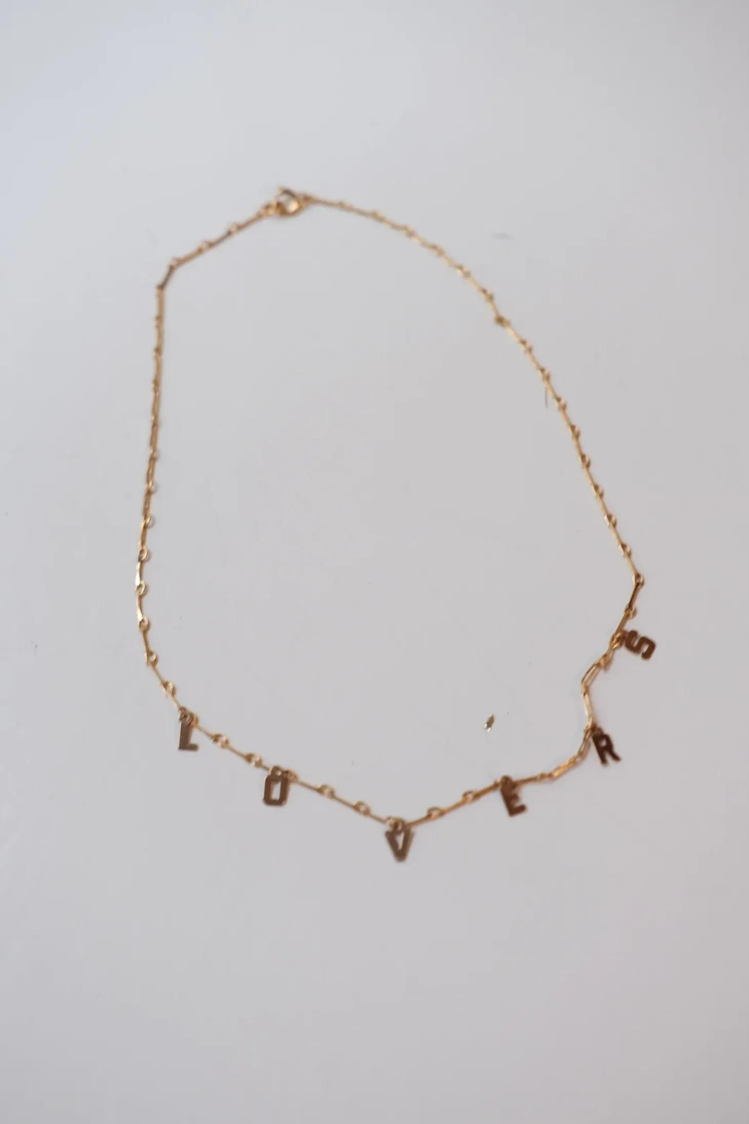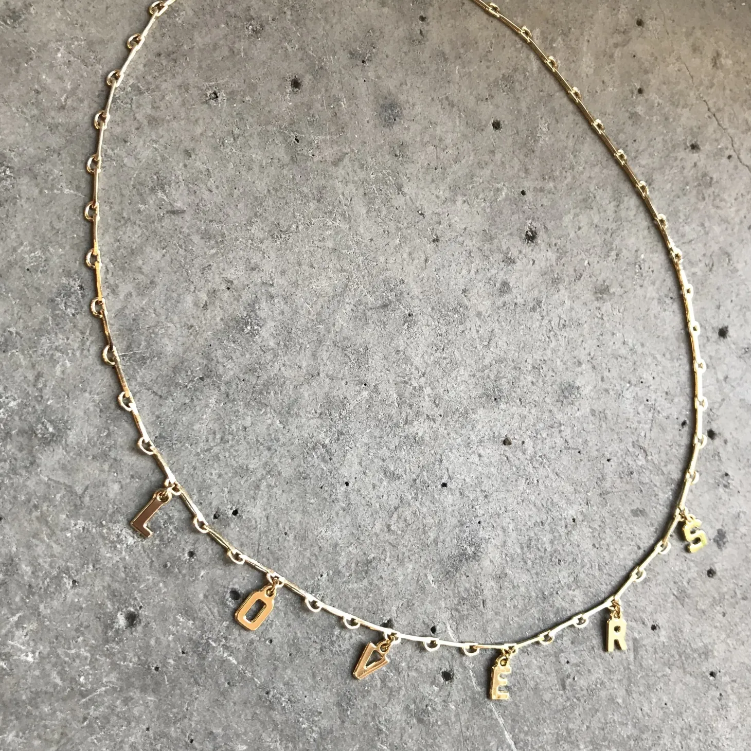 Charms-halskæde i 24 karat forgyldt messing lavet af den tyske designer Malaika Raiss. Halskæden består af en kæde med bogstaver på, der tilsammen staver ‘LOVERS’. Super fint…