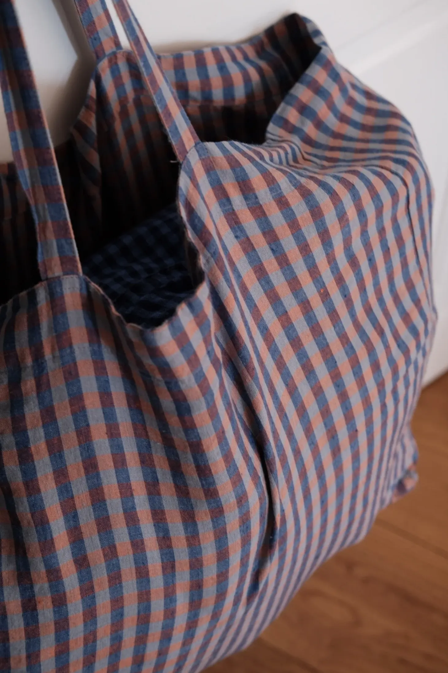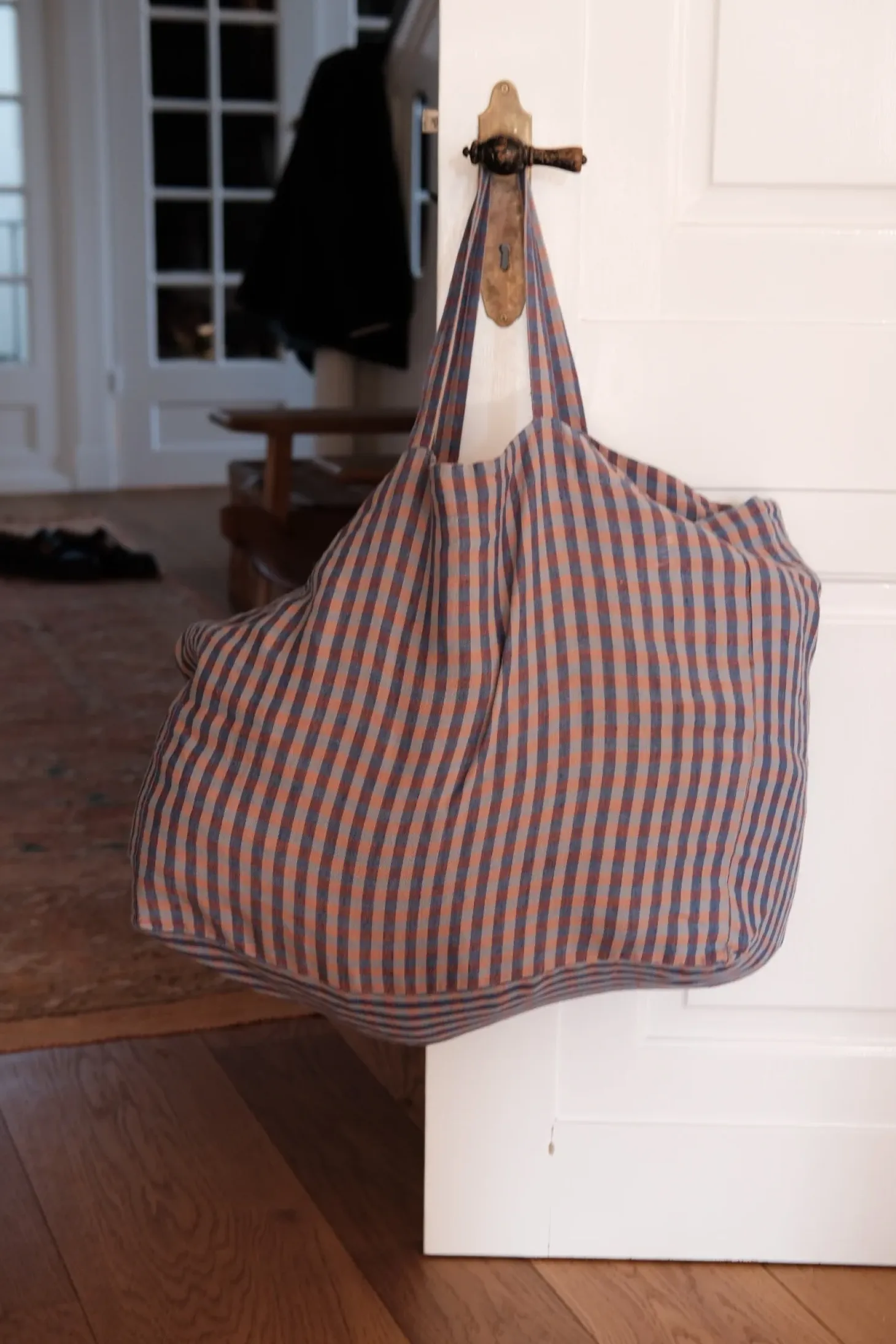 Stor indkøbstaske fra franske Linge Particulier. Den kan rumme en hel del, men den behøver slet ikke at blive fyldt ud. Denne model er i et ternet mønster.