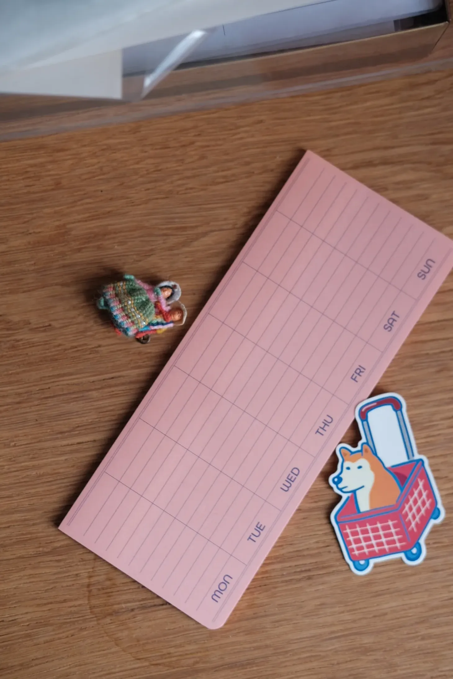 En lille notepad med ugens dage plottet ind i et skema som kan klæbe fast. Til den lille oversigt. Kan også bruges til projekter, familiens skemaer m.m. Blokken er papir.