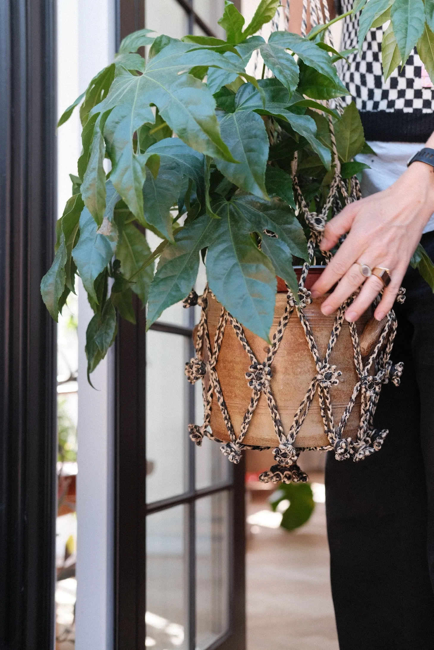 Et ophæng i jute, der er lavet i Bangladesh. Der kan være en blomsterkrukke i.