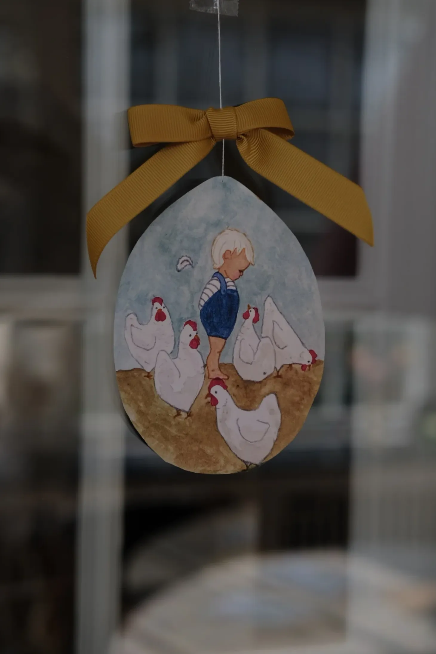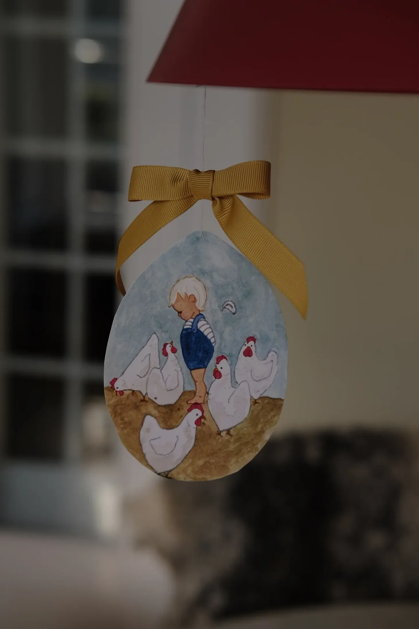 Et fint æg med den lille dreng fra H.C. Andersens eventyret “Det er ganske vist” med pastel sløjfe. Den er lige til at hænge op og skal ikke klippes ud, som mange af Tall Hat Tales andre produkter.