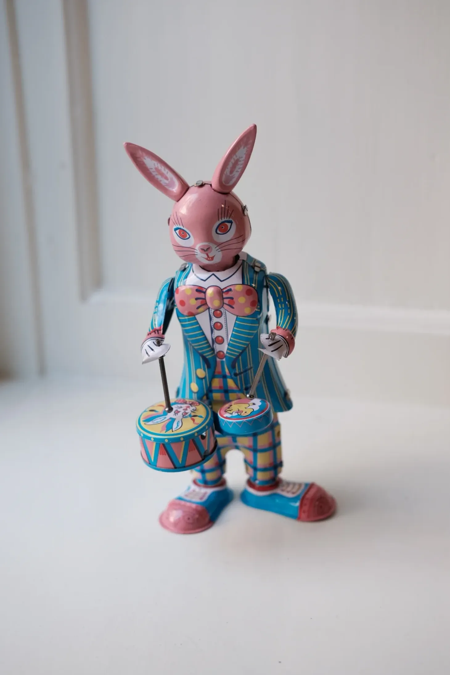 Dekorativ kanin i metal, som kan trækkes op, så den spillet trommer og bevæger sig let rundt.