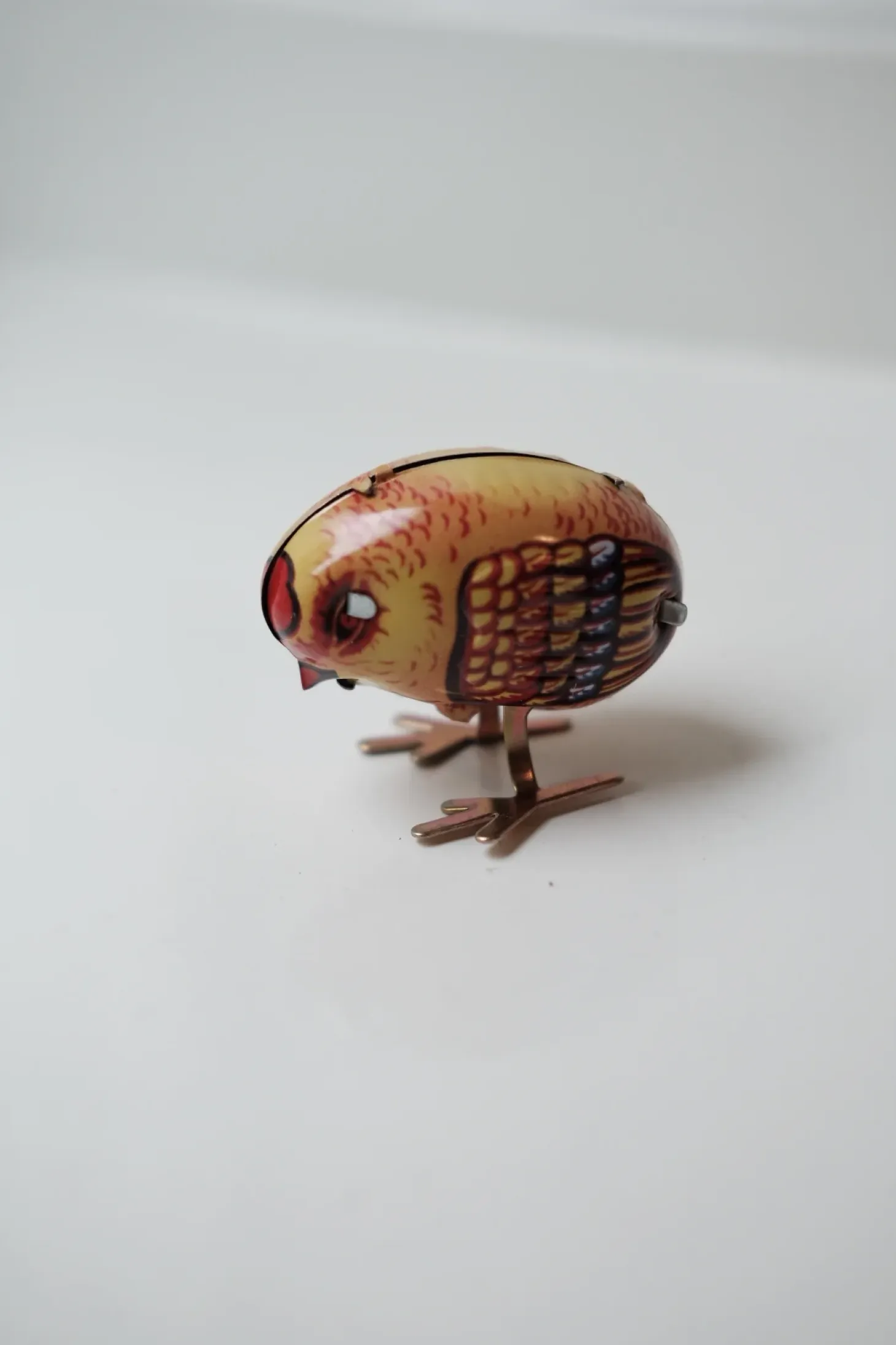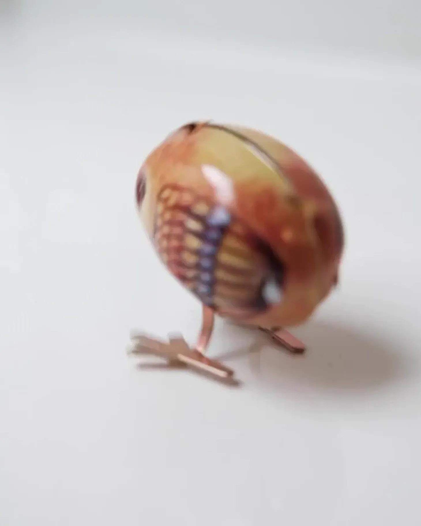 Dekorativ kylling i metal, som kan trækkes op, så den hopper rundt.