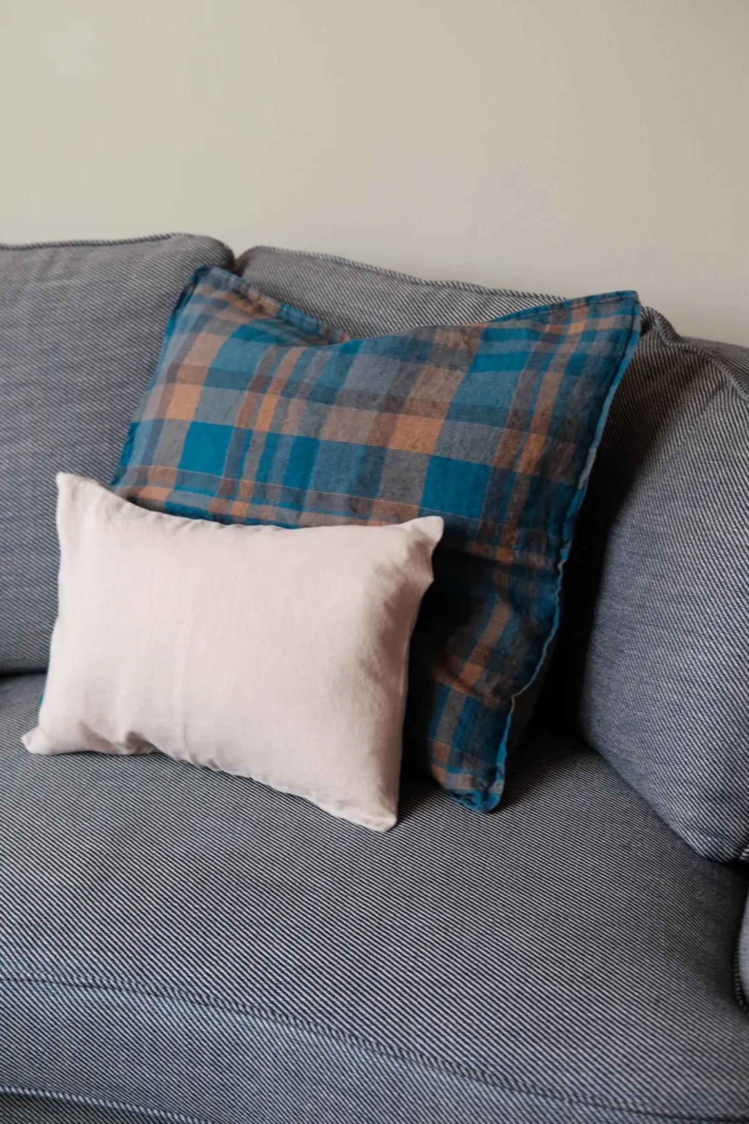 Pude i vasket hør i en smuk ternet udgave fra franske Linge Particulier. De kan virkelig noget med farver – de er særligt dybe og flotte.
