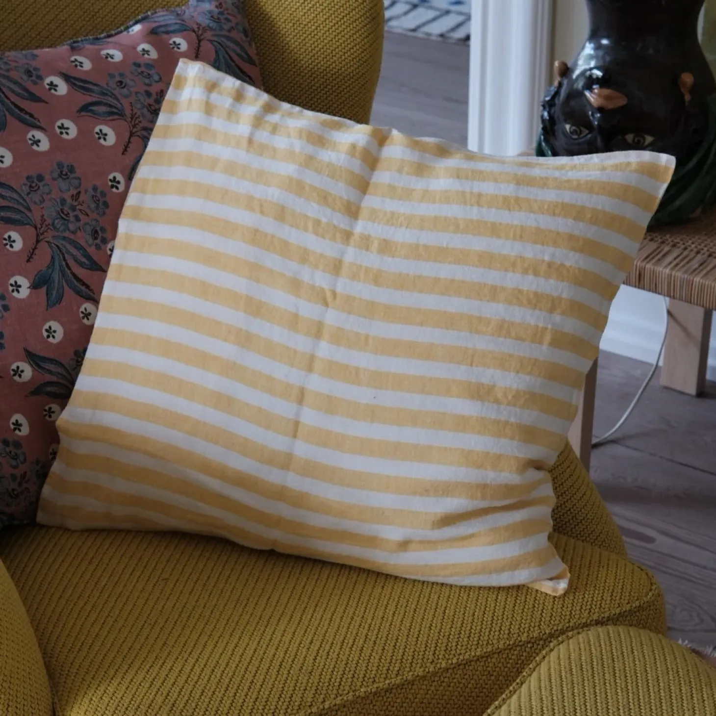En dejlig pude i hør fra franske Linge Particulier, der virkelig kan noget med farver. Puden er lavet af vævet hør, der bagefter er vasket, hvilket giver en helt særlig, blød og holdbar kvalitet, der bare bliver blødere og blødere efter hver vask. Her i en gule striber.