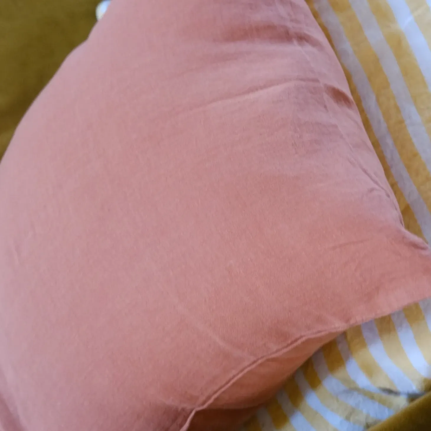 En skøn pude i hør fra franske Linge Particulier. Puden er lavet af vævet hør, der bagefter er vasket, hvilket giver en helt særlig, blød og holdbar kvalitet, der bare bliver blødere og blødere efter hver vask. Her i en rødlig jordfarve farve.