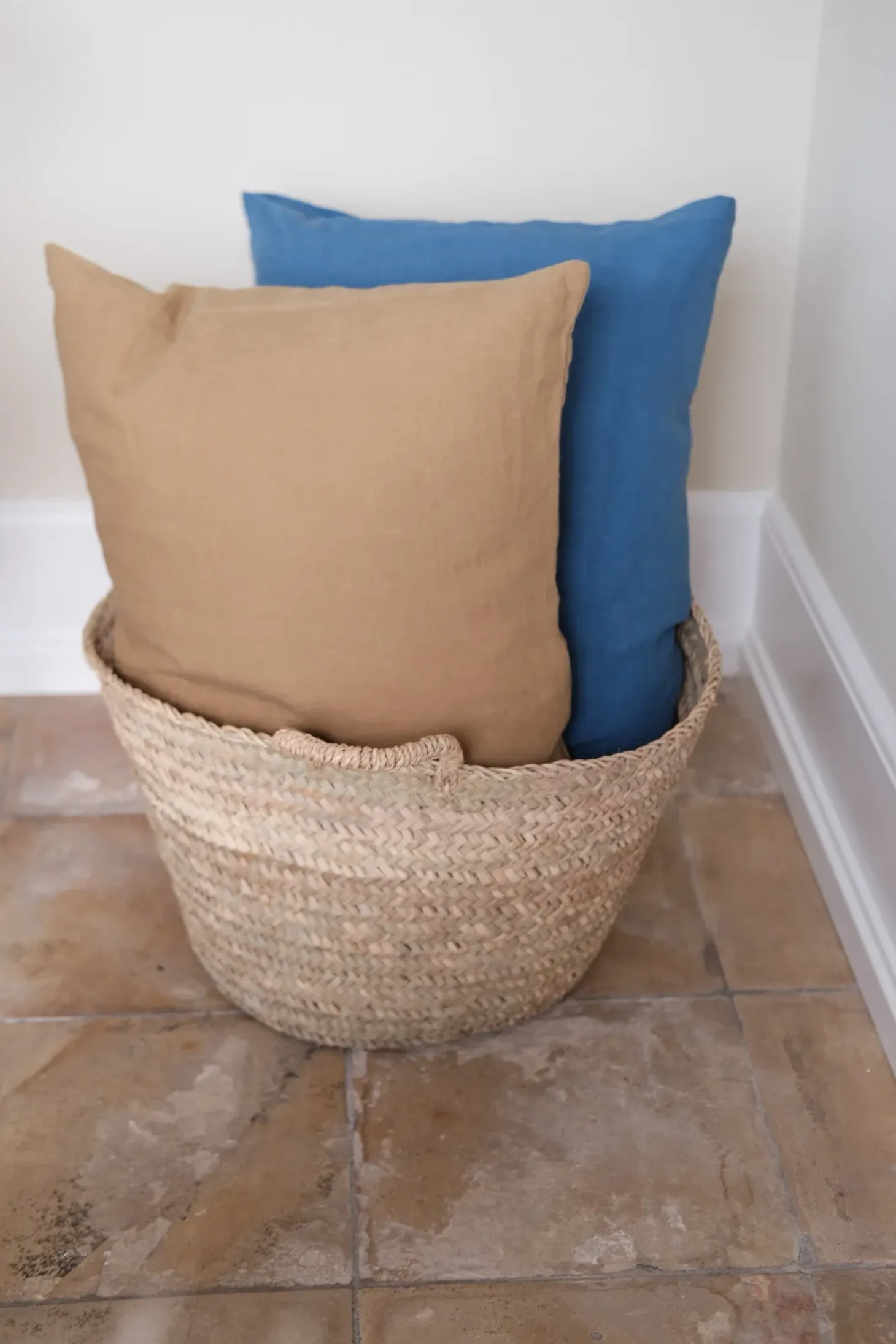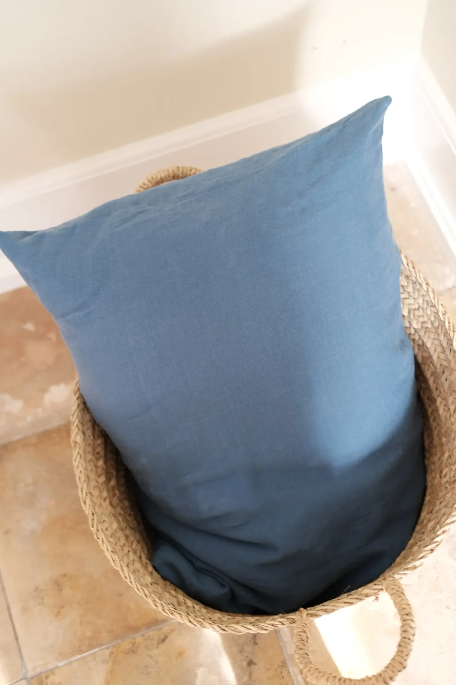 En dejligt stor hørpude fra franske Linge Particulier i en flot blå. De kan bare noget helt særligt med farver… Pudebetrækket er lavet i vævet hør, der bagefter er vasket, hvilket giver en helt særlig, blød og holdbar kvalitet, der bare bliver blødere og blødere efter hver vask. Jeg elsker at bruge denne størrelse i sengen som ‘læsepude’ og udendørs i en kurvestol.