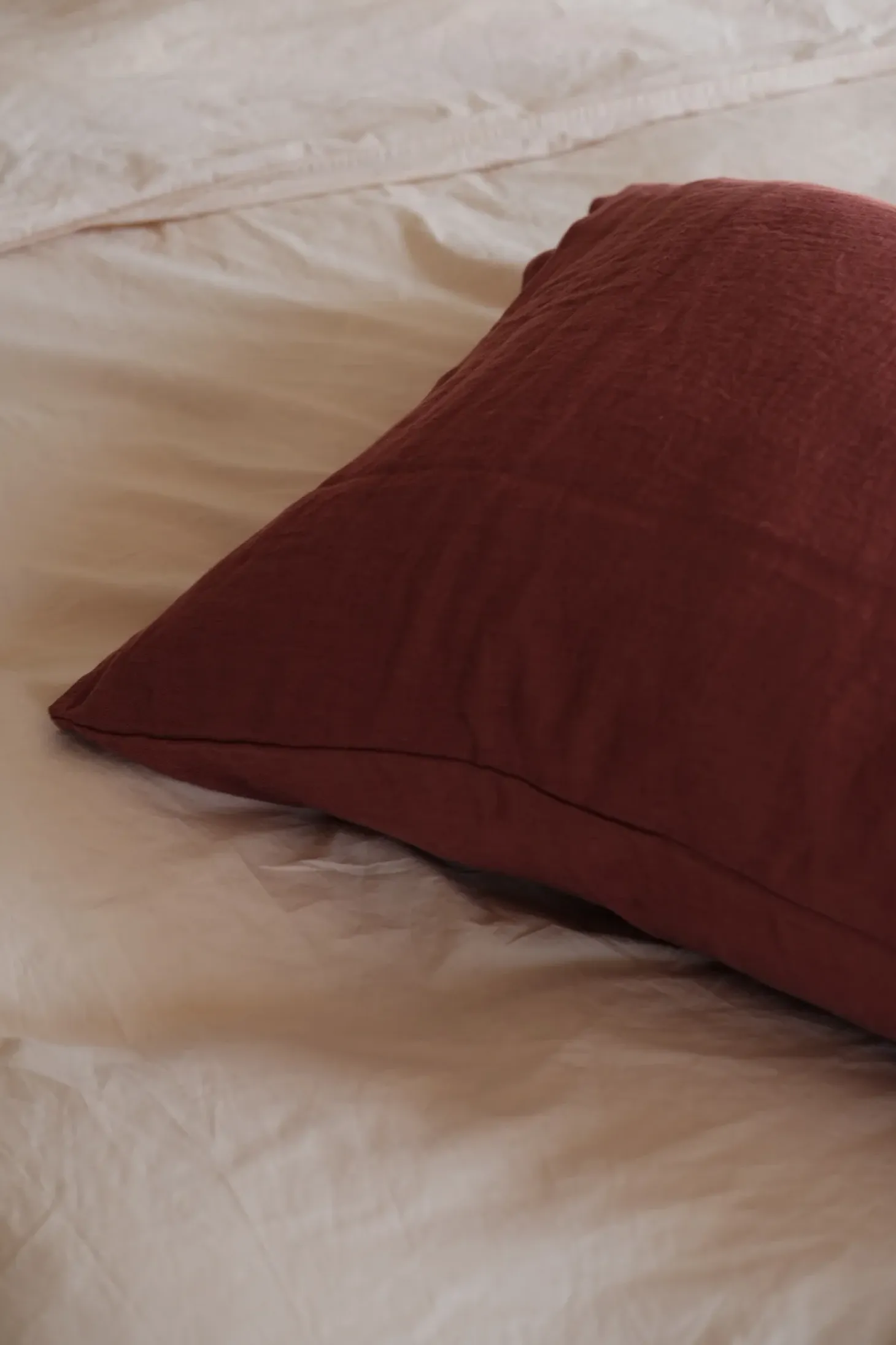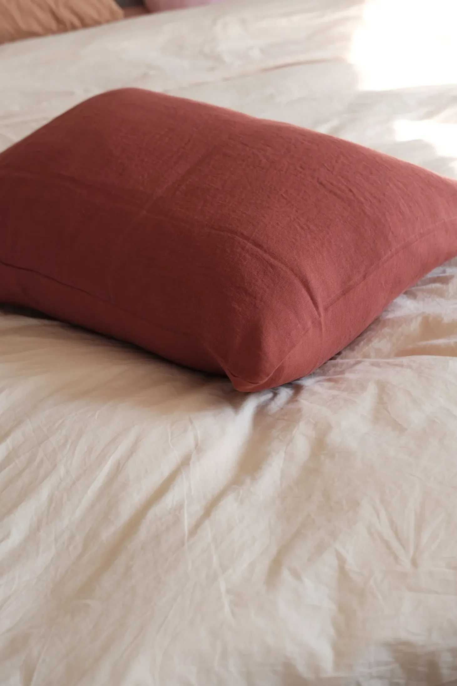 En dejligt stor hørpude fra franske Linge Particulier i en lækker rødbrun farve. De kan bare noget helt særligt med farver… Pudebetrækket er lavet i lavet i vævet hør, der bagefter er vasket, hvilket giver en helt særlig, blød og holdbar kvalitet, der bare bliver blødere og blødere efter hver vask. Jeg elsker at bruge denne størrelse i sengen som ‘læsepude’ og udendørs i en kurvestol.