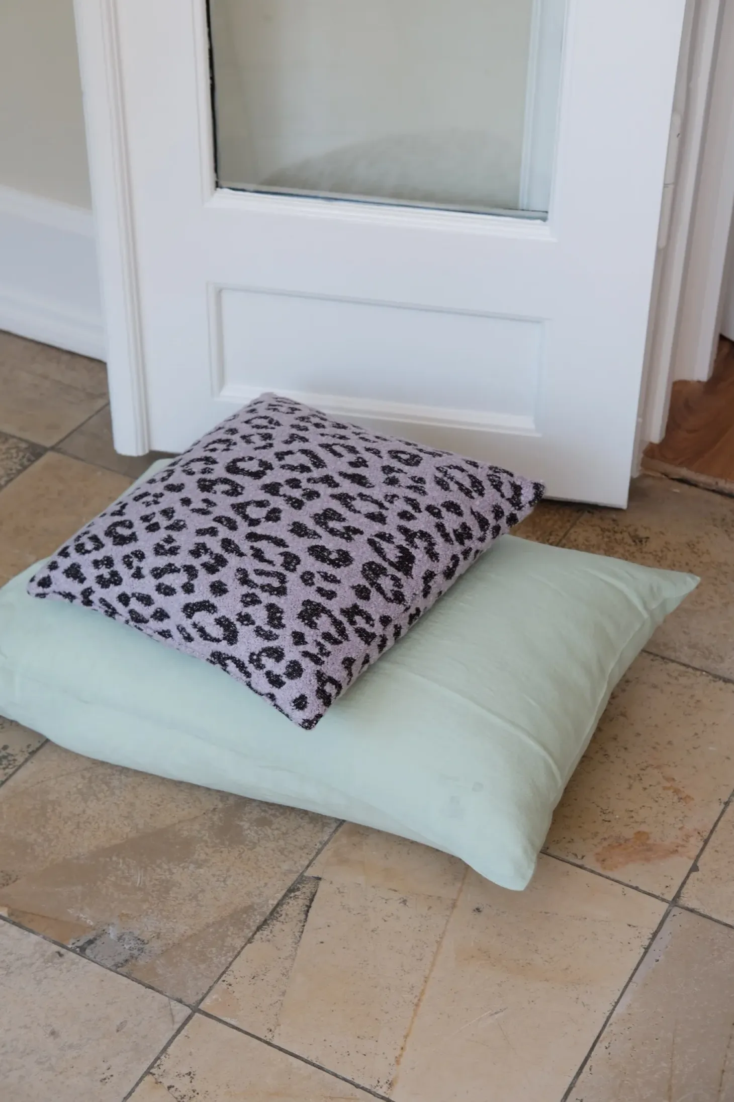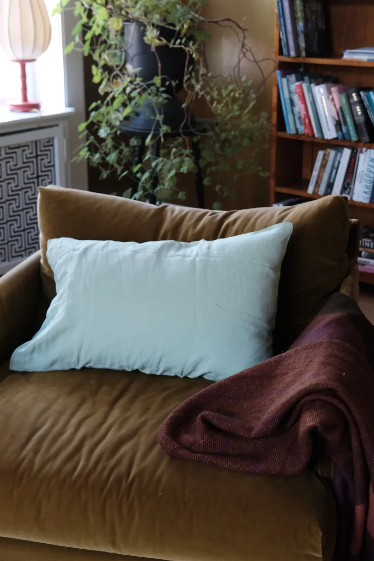 Pude i vasket hør i en klar blå fra franske Linge Particulier. De kan virkelig noget med farver – de er særligt dybe og flotte.