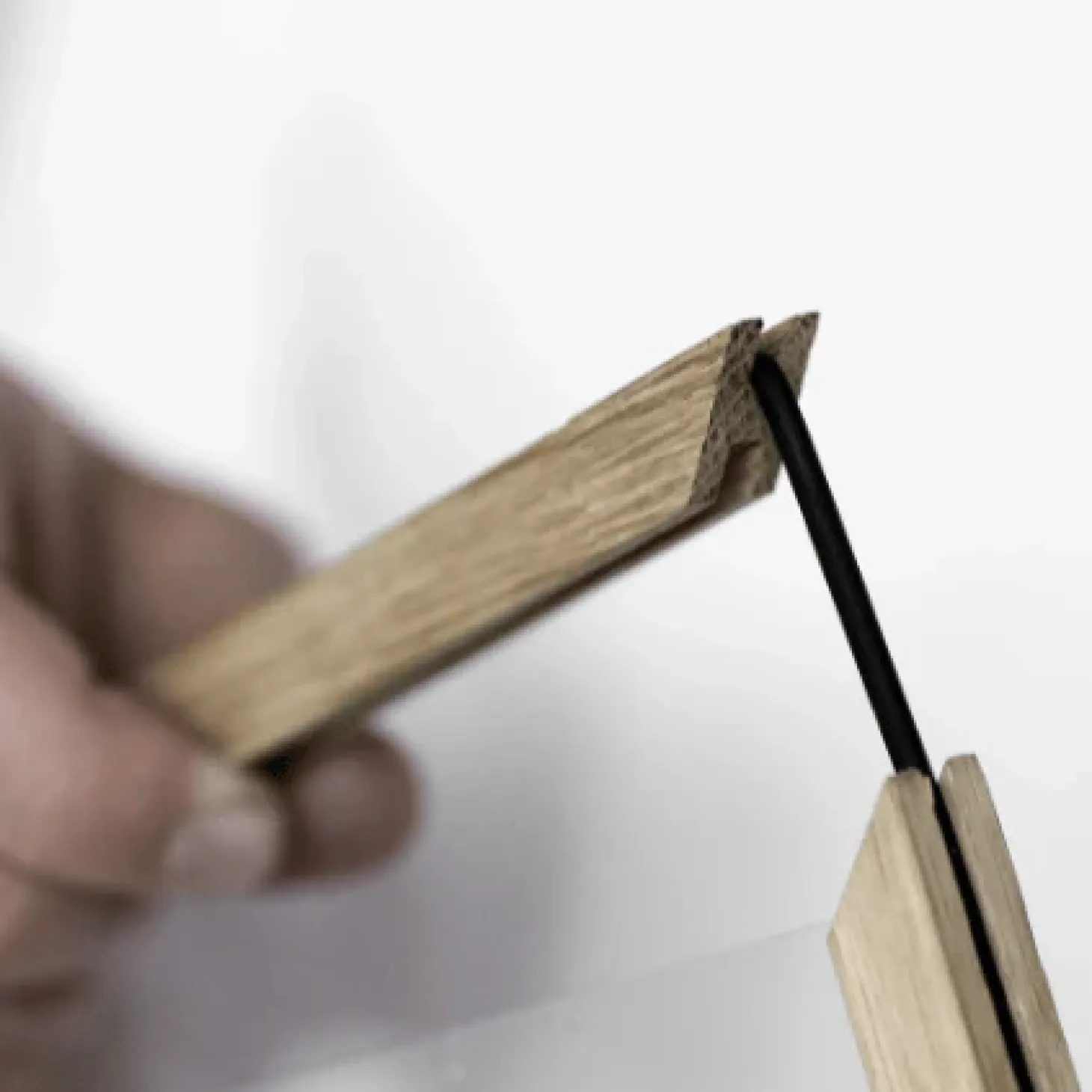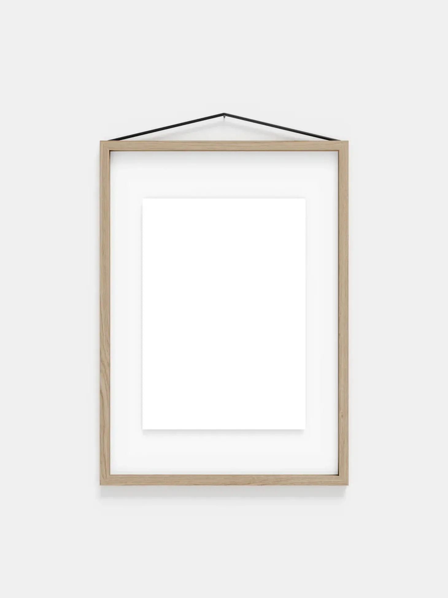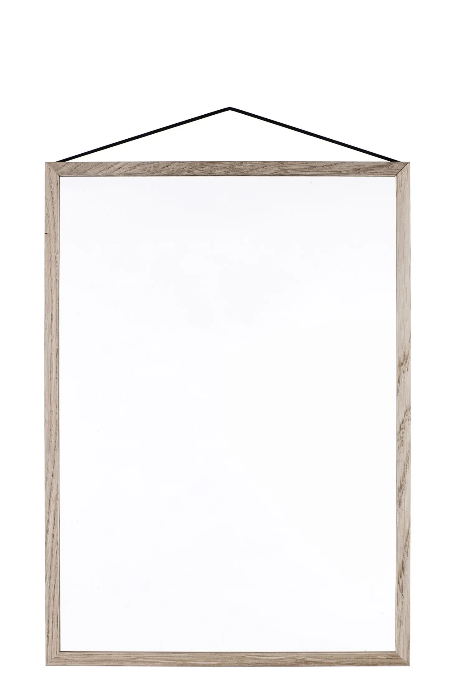 Meget lækker ramme i egetræ med plexiglas. Rammen holdes sammen af en elastik, så man kan kalde det en moderne skifteramme. Elastikken gør det nemt at skifte billedet og fungerer samtidig som ophæng.