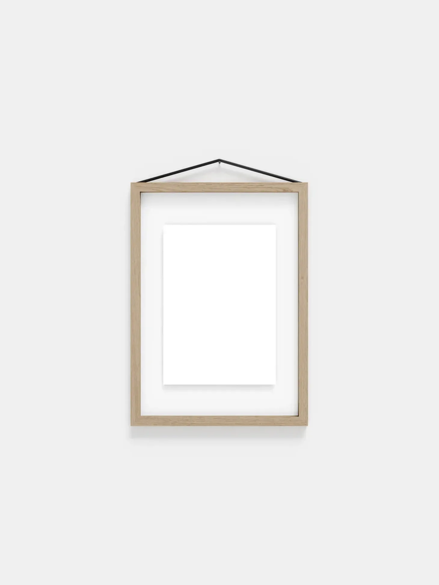 Smuk ramme i egetræ med plexiglas. Rammen holdes sammen af en elastik, så man kan kalde det en moderne skifteramme. Elastikken gør det nemt at skifte billedet og fungerer samtidig som ophæng.