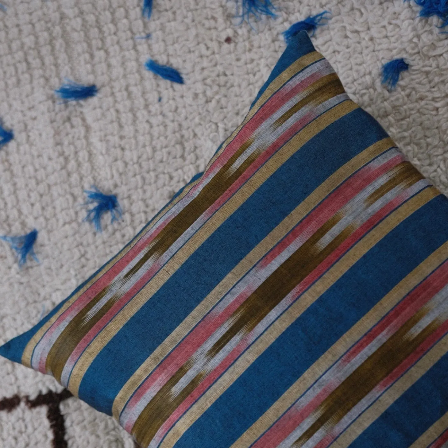 Vær den første til at anmelde “Silkepude • Håndvævet Råsilke • 50×50 • Blå, Rød og Grøn Ikat” Annuller svar