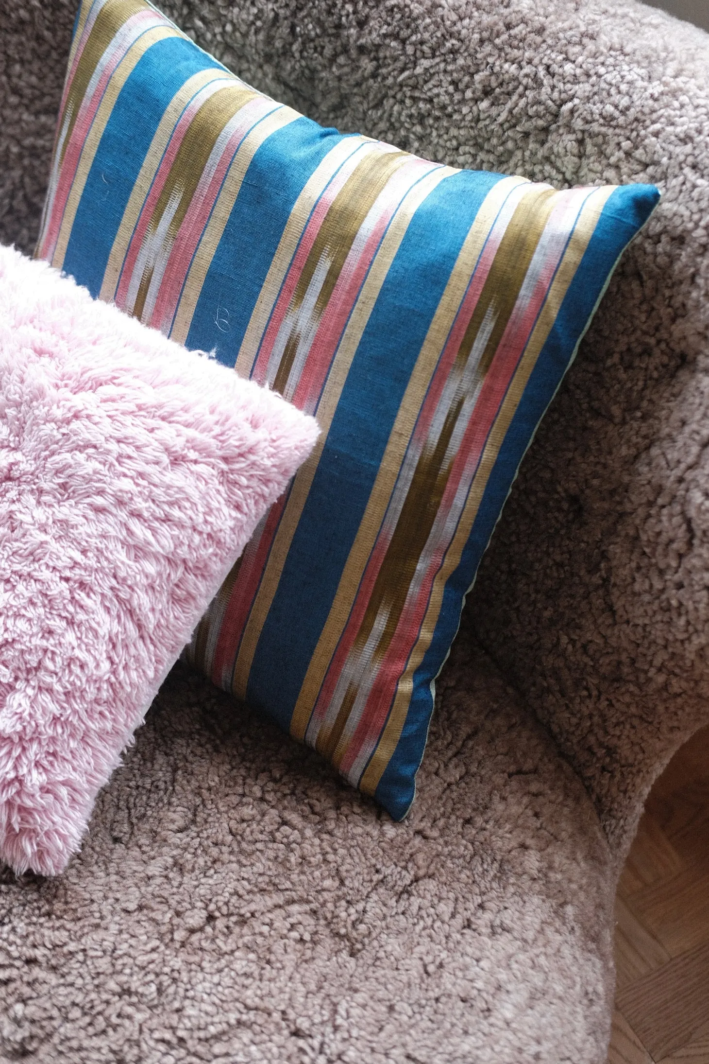 En flerfarvet pude med en historie. Puden i råsilke er vævet i hånden. De er designet af danske Østerland, men de er blevet lavet af Syriske kvindelige flygtninge, som befinder sig i tyrkiet.