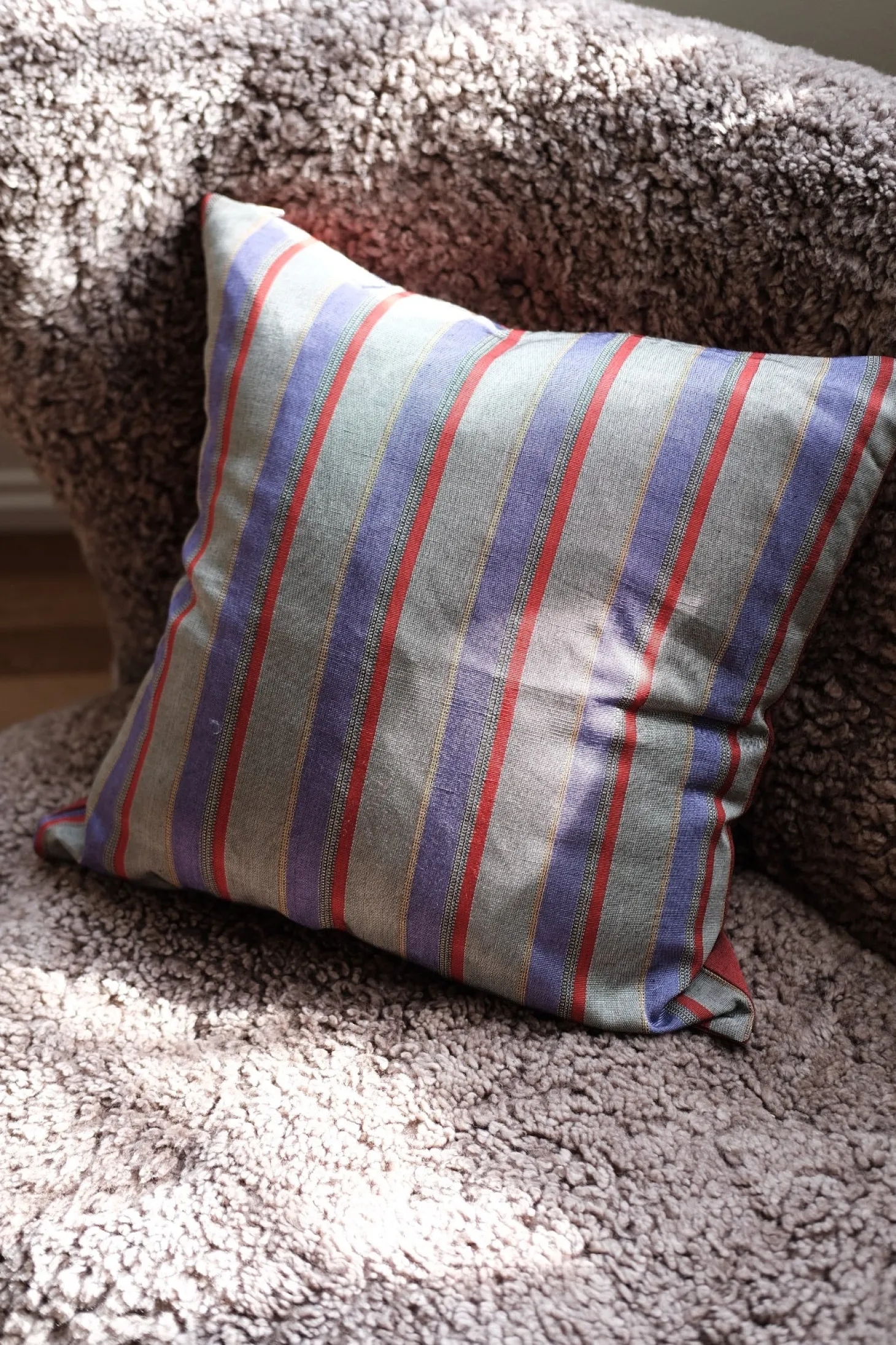 Vær den første til at anmelde “Silkepude • Håndvævet Råsilke • 50×50• Lilla, Rød og Grå • Strib” Annuller svar