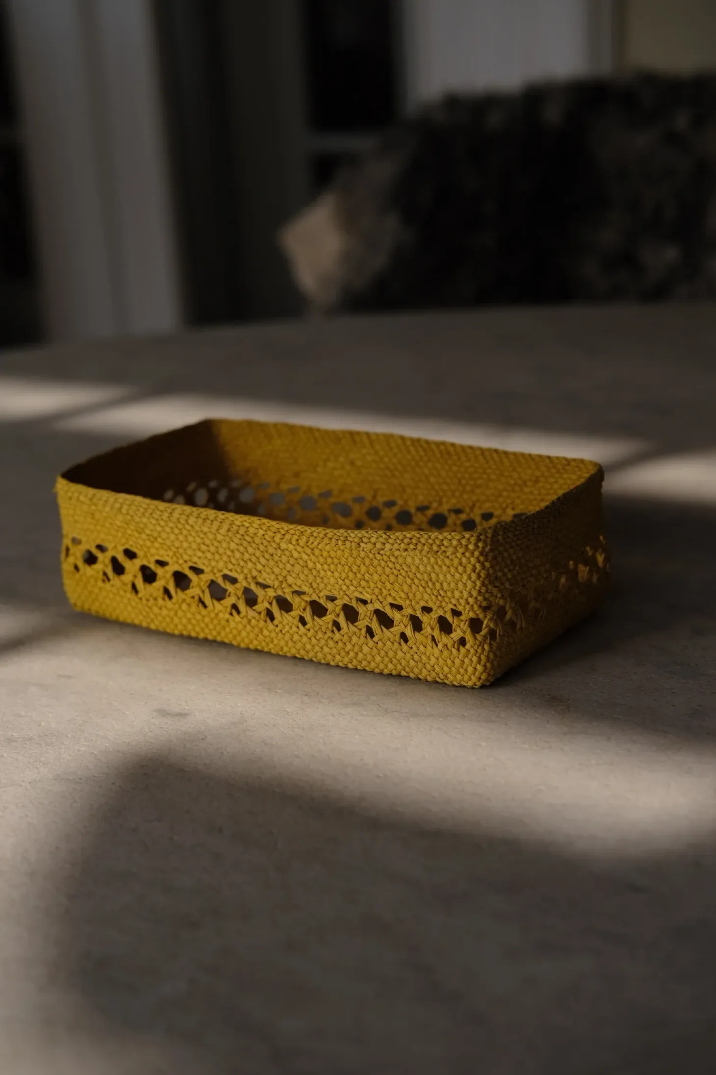 En hyggelige lille kurv i gule palmeplade. Brug den til servering af brød, frugt, chips mv. Mønster og materiale er interessant og skønt sammen med alt det porcelæn, stål og glas jeg har i skabene. Den passer godt ind et utal af steder i dit hjem. Det naturlige materiale bløder op og skaber stemning.