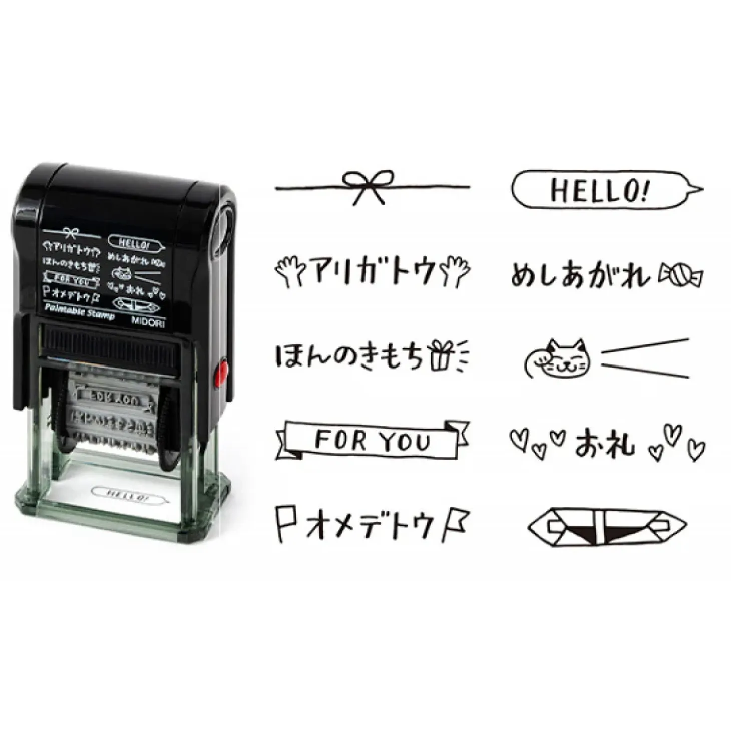 Et stempel med engelske og japanske udtryk. Stemplet har 10 motiver og kan roterer mellem dem. Det er lige til at bruge på gaver, madpakker eller bare som en lille hilsen.