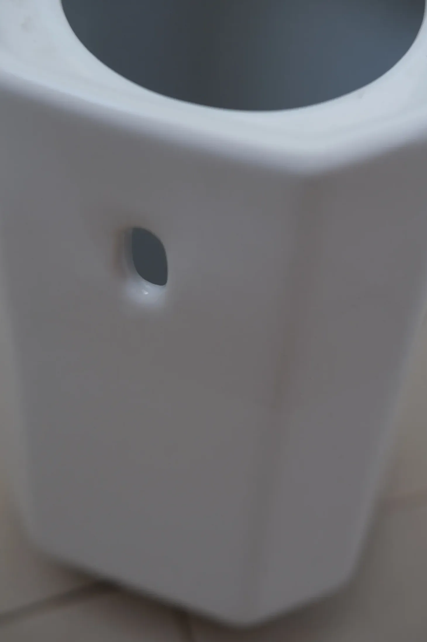 En holder til toiletbørsten i keramik. Den er lavet til at hænge på væggen på et hængsel, så den kan tages ned og rengøres.