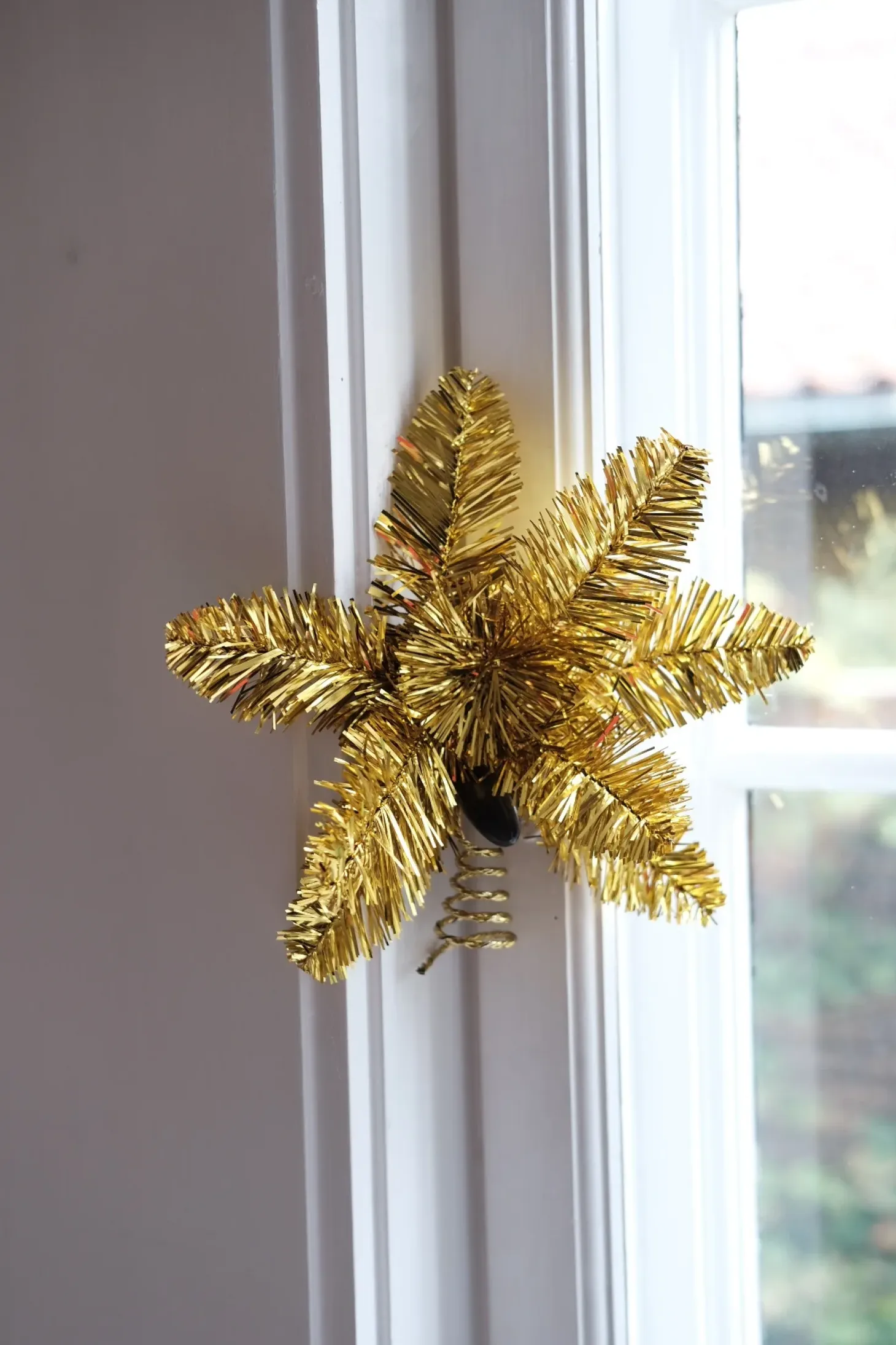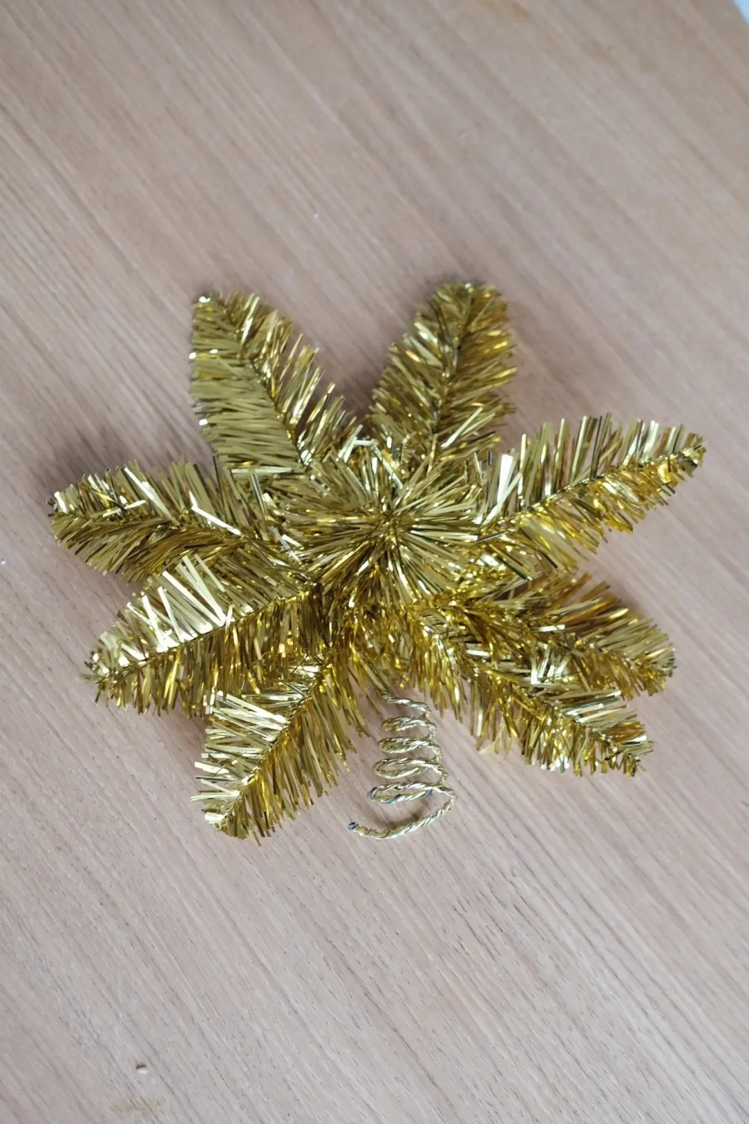 En meget klassisk topstjerne i guld lametta. Den er lavet i kraftig ståltråd, så den kan bøjes lidt frem og tilbage. Så den kan laves mere 3D. Vi har også brugt den til at hænge i vinduerne i en snor.