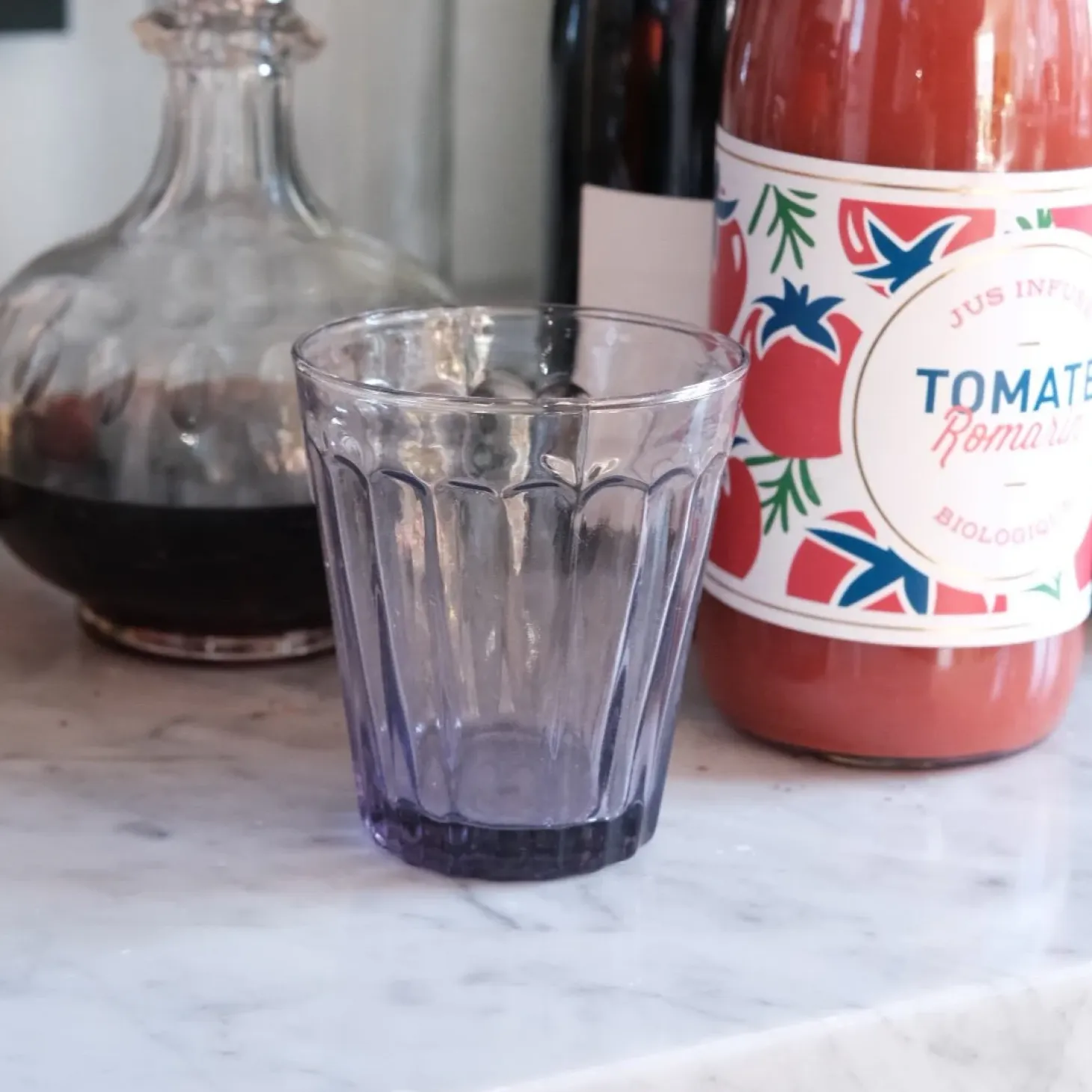 Et vandglas, men som man kalder et vinglas i Italien. Det er mundblæst i de smukkeste farver. De har et par riller, og det gør farven endnu smukkere for så kommer der lidt spil i. Det giver en meget smuk borddækning at bruge farvede glas – det giver et indtryk af at man har gjort sig umage.