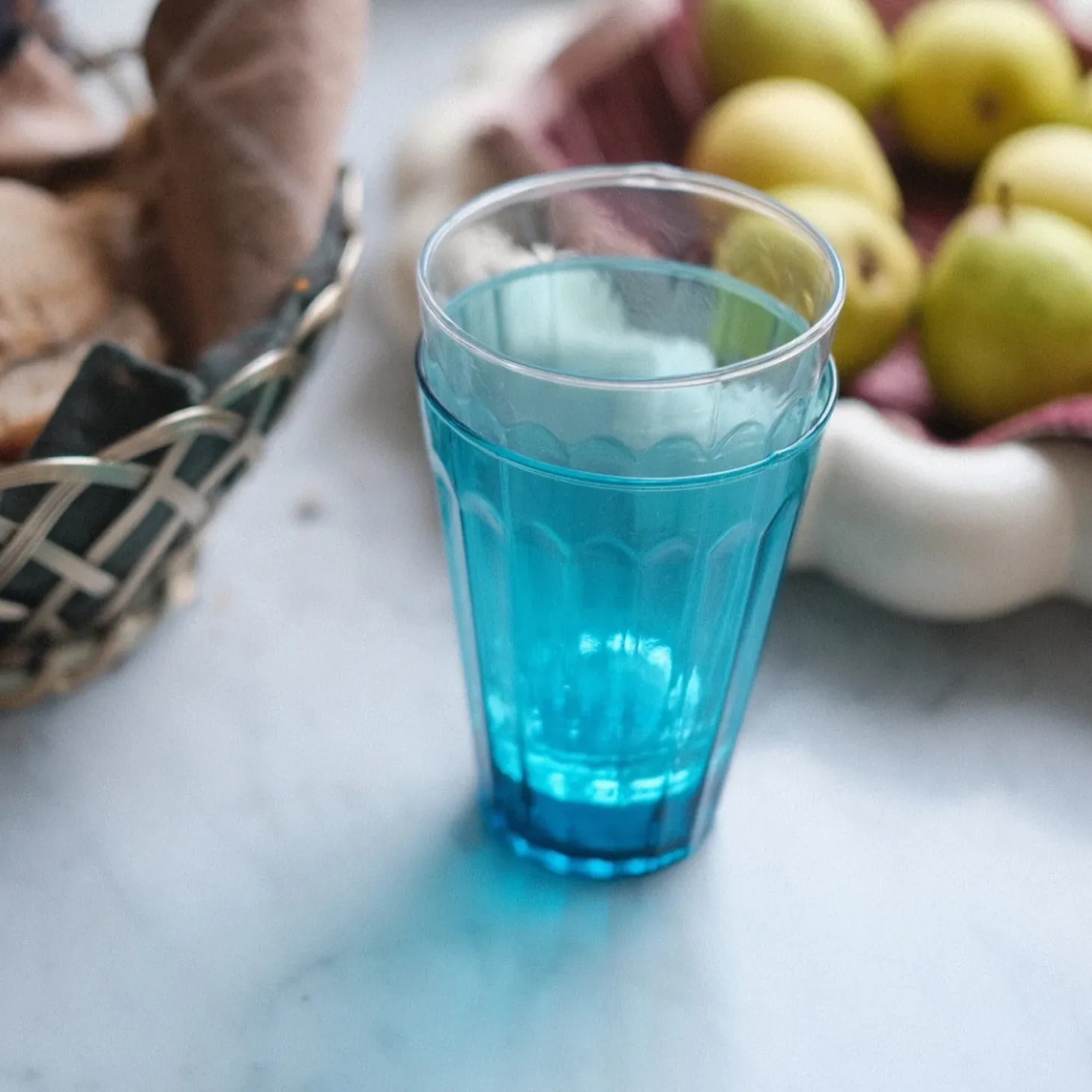 Et vandglas, men som man kalder et vinglas i Italien. Det er mundblæst i de smukkeste farver. De har et par riller, og det gør farven endnu smukkere for så kommer der lidt spil i. Det giver en meget smuk borddækning at bruge farvede glas – det giver et indtryk af at man har gjort sig umage.