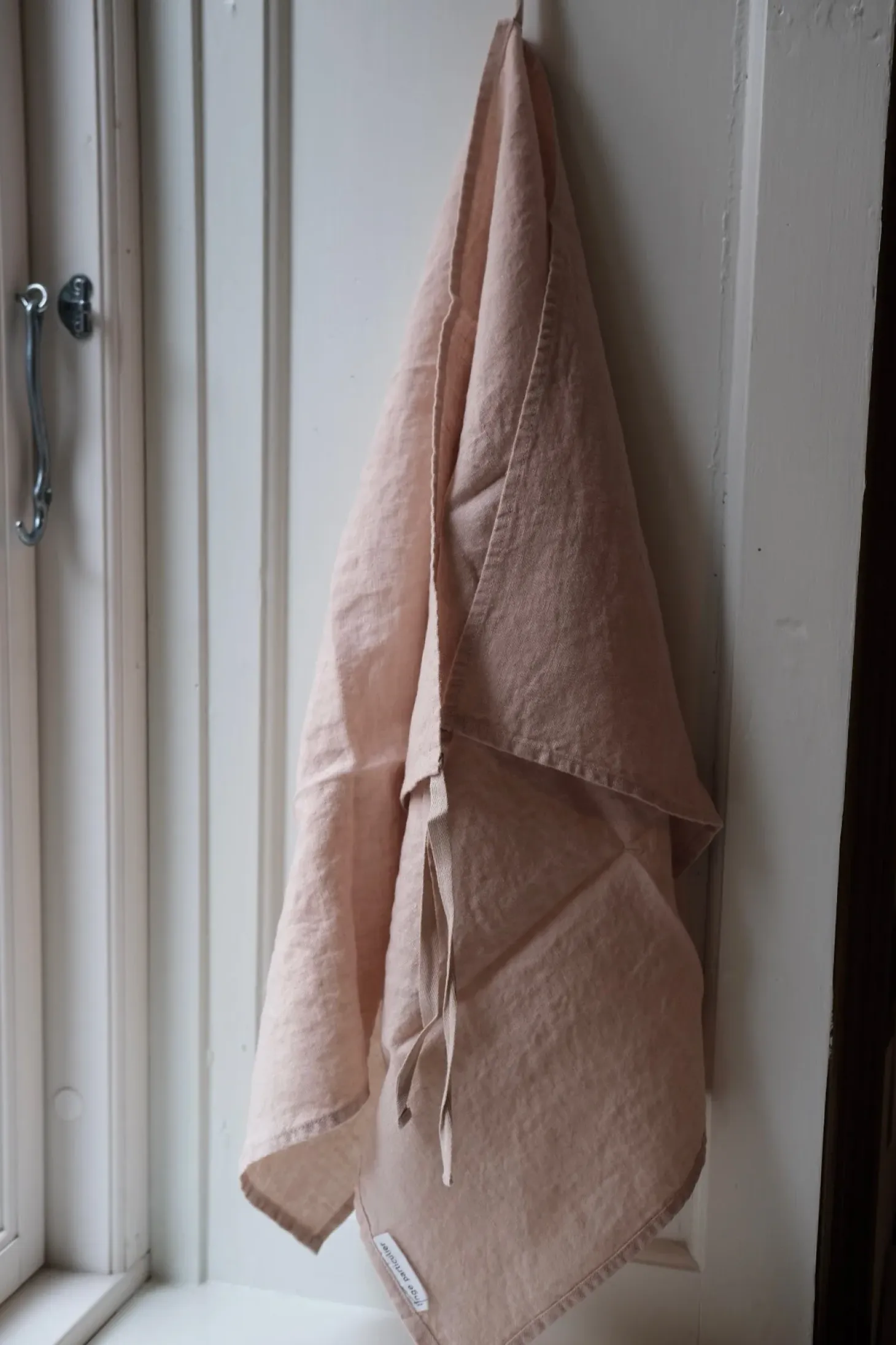 Et viskestykke i en lys sandfarvet. Det er 100% vasket hør, så den krøller let. Det kan vi godt lide. Udover at være et viskestykke er det også muligt at bruge det som forklæde, da der er sat snore i hver ende – mega smart!