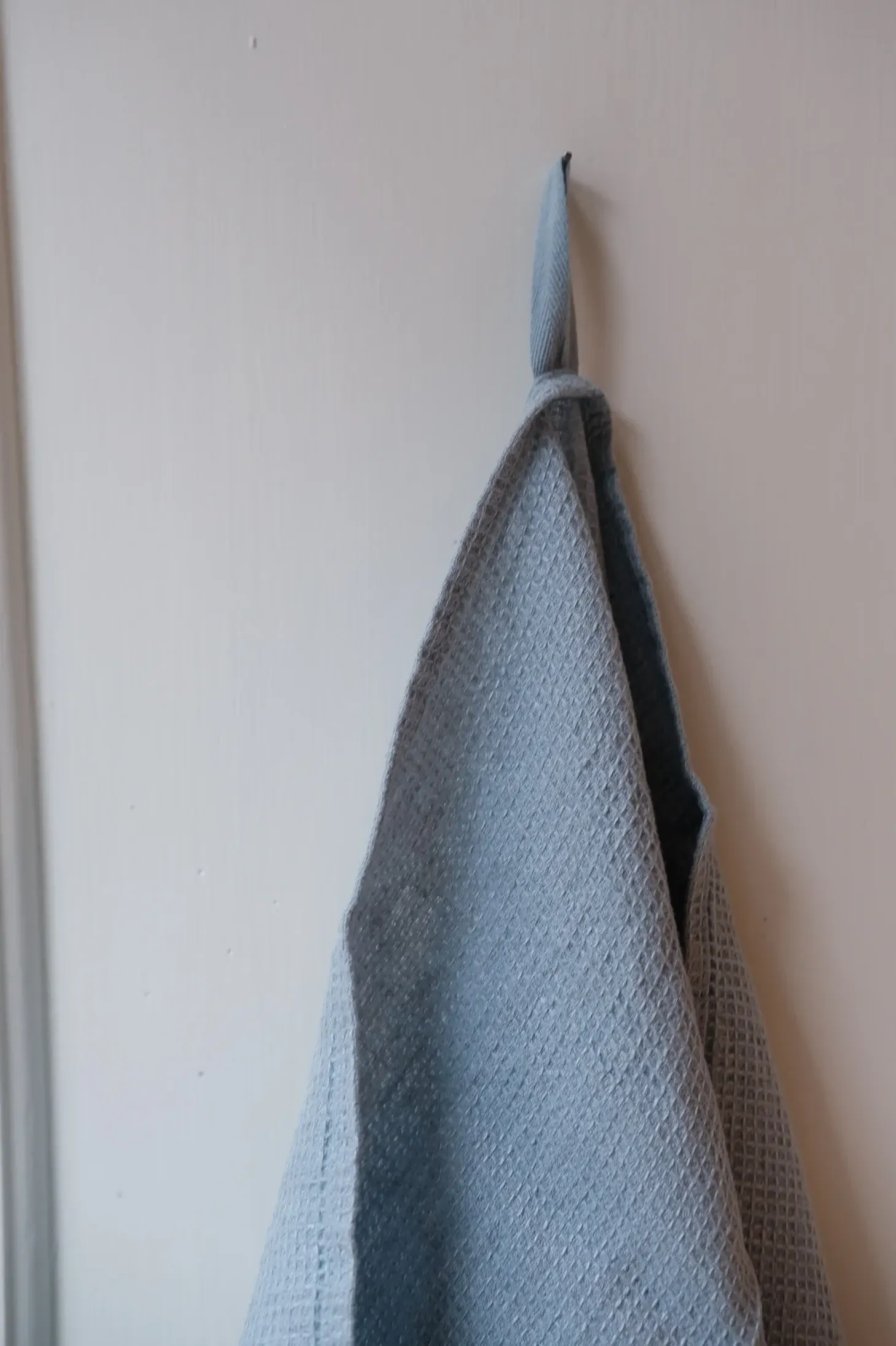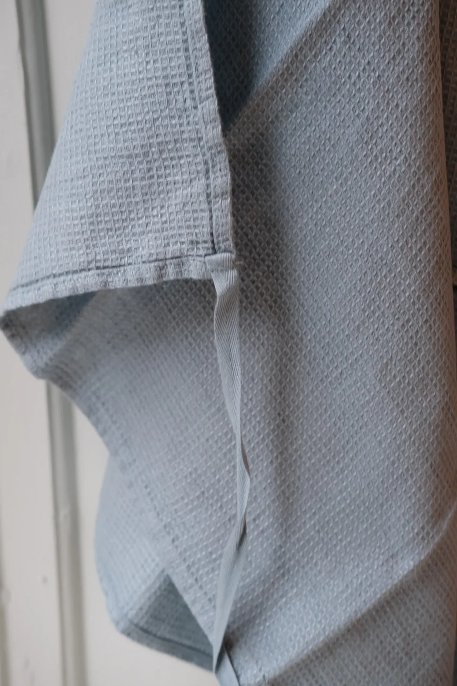 Et viskestykke i en lækker blå og i vaflet struktur. Det er 100% vasket hør, så den krøller let. Det kan vi godt lide. Udover at være et viskestykke er det også muligt at bruge det som forklæde, da der er sat snore i hver ende – mega smart!